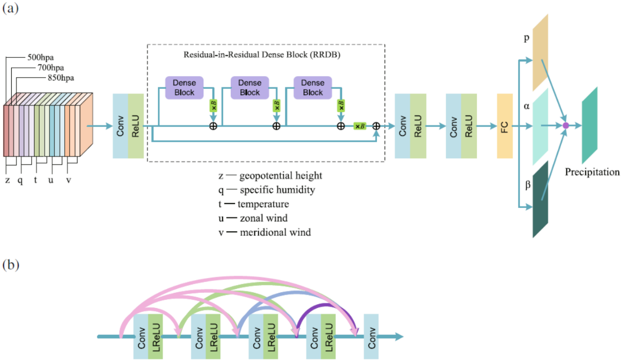 最近,中国科学院地球环境研究所气候变化集成-模拟-同化-预测团队(CLIMAP)联合西安石油大学计算机学院人工智能团队,设计了一个基于残差密集块的卷积神经网络模型(RRDBNet,见图1),用于黄河中游地区降水的统计降尺度研究;并将该RRDBNet模型与广义线性回归模型,及两个流行的深度学习模型进行对比研究。我们的研究结果表明,所提出的RRDBNet模型在流域尺度降水降尺度模拟中具有良好的性能,可以很好地再现高分辨率降水的时空特征。相对于广义线性回归模型,RRDBNet模型将年平均降水量的均方根误差降低了19%,并将皮尔逊相关系数提高了6%(图2)。值得指出的是,相对于广义线性回归模型,该模型将极端降水指数R95pR99p)的均方根误差降低了58%79%),皮尔逊相关系数提高了38%145%)。对于日降水的概率密度函数,进一步证明RRDBNet模型在极端降水频率方面模拟效果更好。