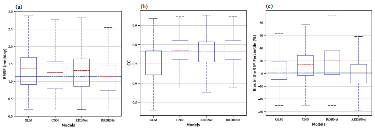 2, 人工智能模型模拟(a)平均降水量的均方根误差,(b)皮尔逊相关系数,以及(c)第95百分位降水百分比偏差的箱图