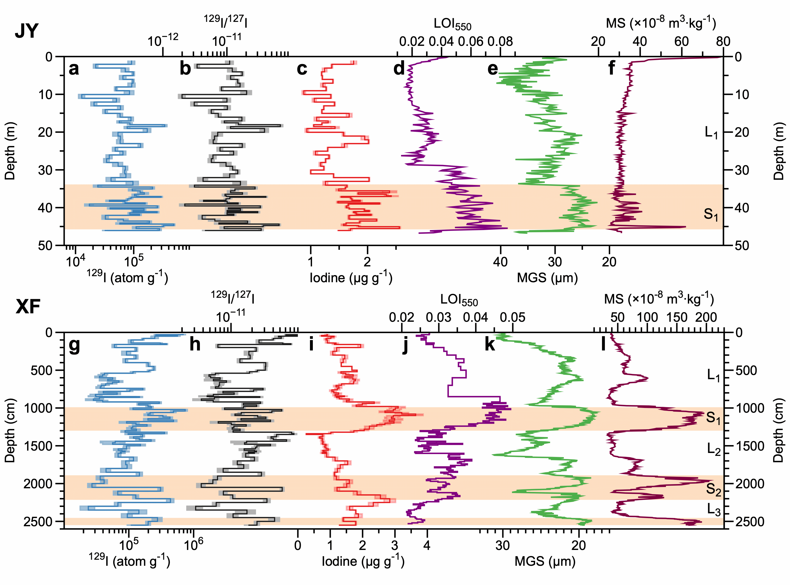 此外,研究还发现,与上述几项指标相比,在长时间尺度上,西峰剖面129I通量记录的部分地磁漂移事件存在缺失、时间跨度缩短以及振幅减小等问题。他们认为,这是由于深层黄土经历了更长时间的有机质降解,有机质结合态碘这一主要组分随之分解,从而导致较早形成的黄土中129I通量信息的缺失。