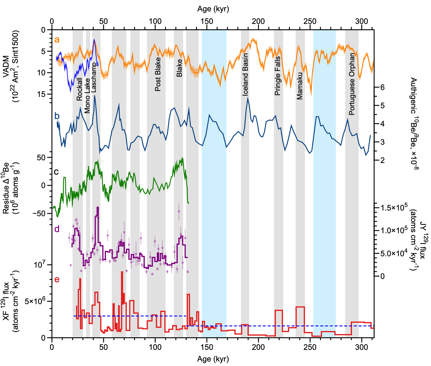 图2 黄土剖面129I沉积通量与古地磁场强度记录对比