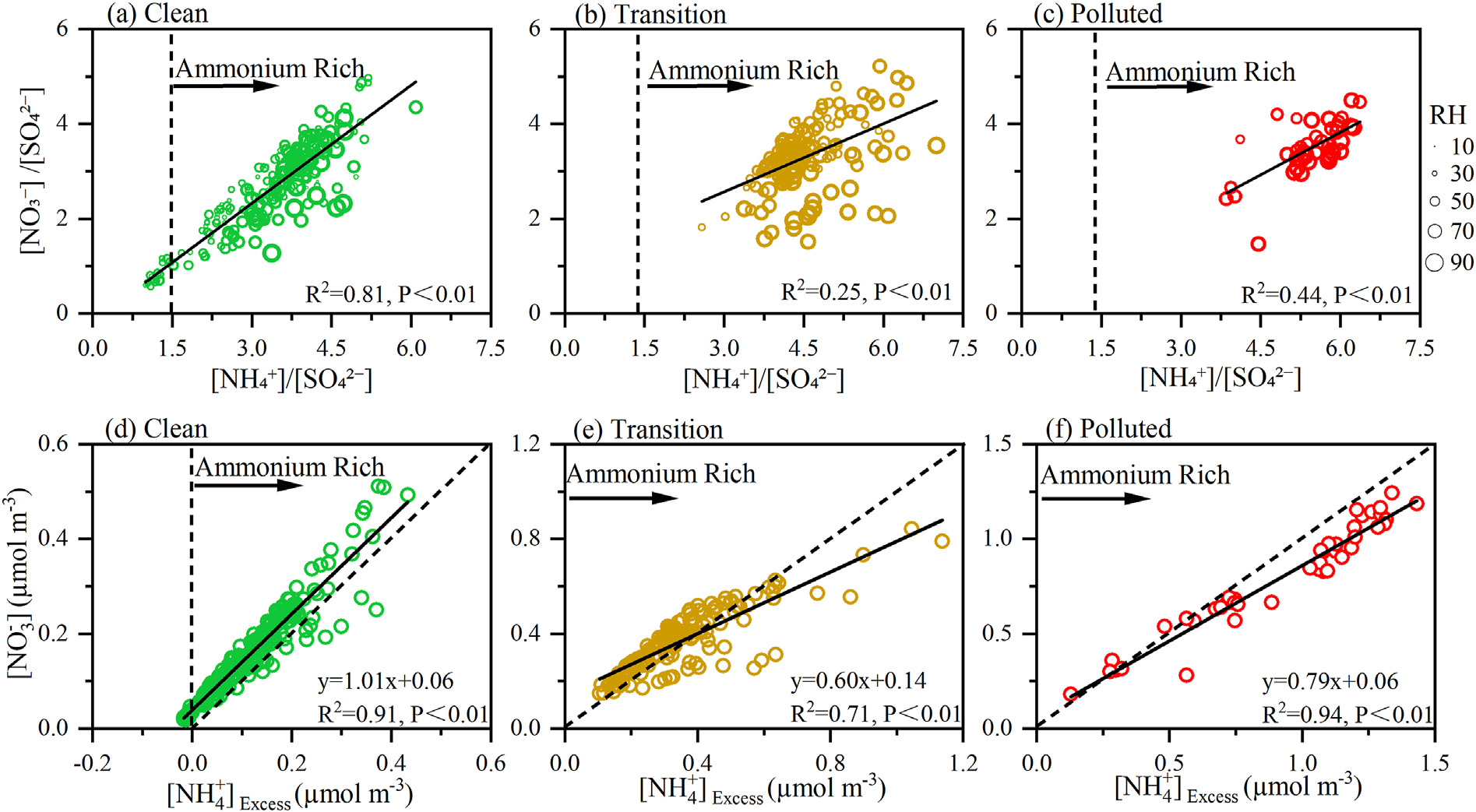 地球环境研究所科研人员于2017年至2020年在西安和宝鸡开展多次气溶胶高时间分辨率实时观测,结合气象要素和气溶胶前体物,综合运用机器学习模型等方法探讨了该区域气溶胶中离子组分的时空分布特征、形成机制和对PM2.5增长速度的影响等。研究结果表明,随着气溶胶污染的加重,硝酸盐对PM2.5质量浓度的贡献显著增加,大气中过量氨(NH3)是导致NO3-高浓度的主要因素之一。机动车限行协同减排了NOxNH3,可有效缓解颗粒物污染。颗粒物爆发性增长在污染过渡期(75 μg m-3 ≤PM2.5<150 μg m-3)发生的频率最高。相对湿度和一次排放源是影响PM2.5爆发性增长的重要因素和主要来源。