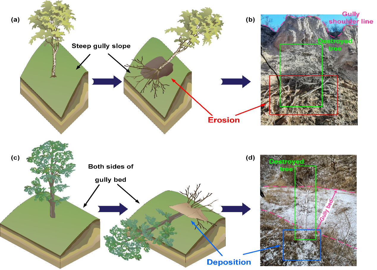 研究结果表明,暴雨导致流域内13%的树木被破坏,破坏树木主要分布在陡坡(坡度45.5°-50.5°)及沟床两侧区域,其中87.4%的树木破坏发生在沟谷区域。暴雨侵蚀和沉积作用均造成了树木的破坏,泥沙沉积影响了更大范围的树木,但溜滑侵蚀对树木的破坏性更强。陡坡区域侵蚀活动导致树木连根拔起或根系暴露,沟床区域泥沙沉积使树干被部分掩埋,两者表现出不同的破坏过程(图1)。研究结果指示,在全球变暖背景下,随着极端气候事件的发生频率增加,黄土高原沟谷区域的林草植被恢复将面临暴雨侵蚀产生的破坏性影响。该研究识别出的树木破坏敏感区和破坏模式,为优化黄土高原林草植被建设和水土保持治理提供了科学依据,对全球其他类似地区极端天气气候事件对陆地生态系统的影响监测具有借鉴意义。