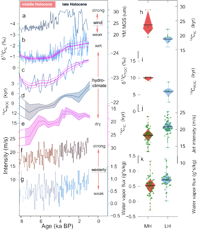 近日,中国科学院地球环境研究所黄土科学全国重点实验室科研人员联合国内外学者,借助高精度测年技术,结合中昆仑山高分辨率黄土记录中的粒度、地化元素和同位素等多种气候代用指标,并采用数值模拟方法,重建了塔里木盆地过去8000年的水文气候变化过程(图2)。研究结果显示,在中全新世(距今8200–4200年),受副热带西风急流向极地移动的影响,塔里木盆地的降水量显著减少。同时,由于西风急流轴的北移,便于更多源于热带夏季风的含水气团频繁深入盆地,导致与盆地高空冷气流相遇,从而增加了夏季暴雨事件的强度。约4000年前,西风急流向赤道偏移,这一变化不仅带来了更多降水,还抑制了夏季风水汽对盆地的入侵,导致水文气候状态发生转变。