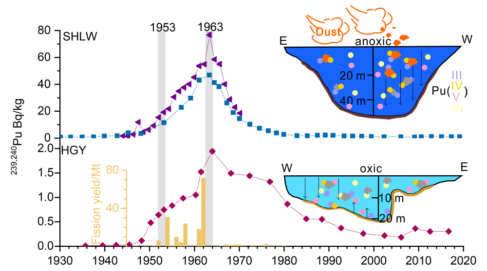 中国科学院地球环境研究所侯小琳研究员团队,以物源组成简单、沉积环境清晰的四海龙湾及湖光岩玛珥湖为研究对象,基于建立的高精度年代学框架,使用研究团队建立的环境超低浓度钚同位素的高精度分析技术,通过分析沉积物中年分辨率的239,240Pu水平及其变化,确定239,240Pu作为“大加速”地层标志物的关键标记年,并重建其在湖水中的清除转移以及沉积后的再迁移过程。研究发现1952年10月31日首次大当量大气核武器试验和1961-1962年的全球大气核武器试验最大时期释放的239,240Pu在两个玛珥湖沉积物中均被清晰记录,前者表现为239,240Pu在1953年首次快速增加,后者表现为1963年的浓度峰值。与此同时,因低价态钚同位素具有更强的亲颗粒性以及四海龙湾较高的沙尘通量,使得239,240Pu在还原性四海龙湾玛珥湖中的清除速率更快、峰更窄。而在氧化性的湖光岩中,受风浪扰动作用,已沉降的239,240Pu会部分解析进入湖水后重新沉降,造成深层已沉降239,240Pu的向上转移。