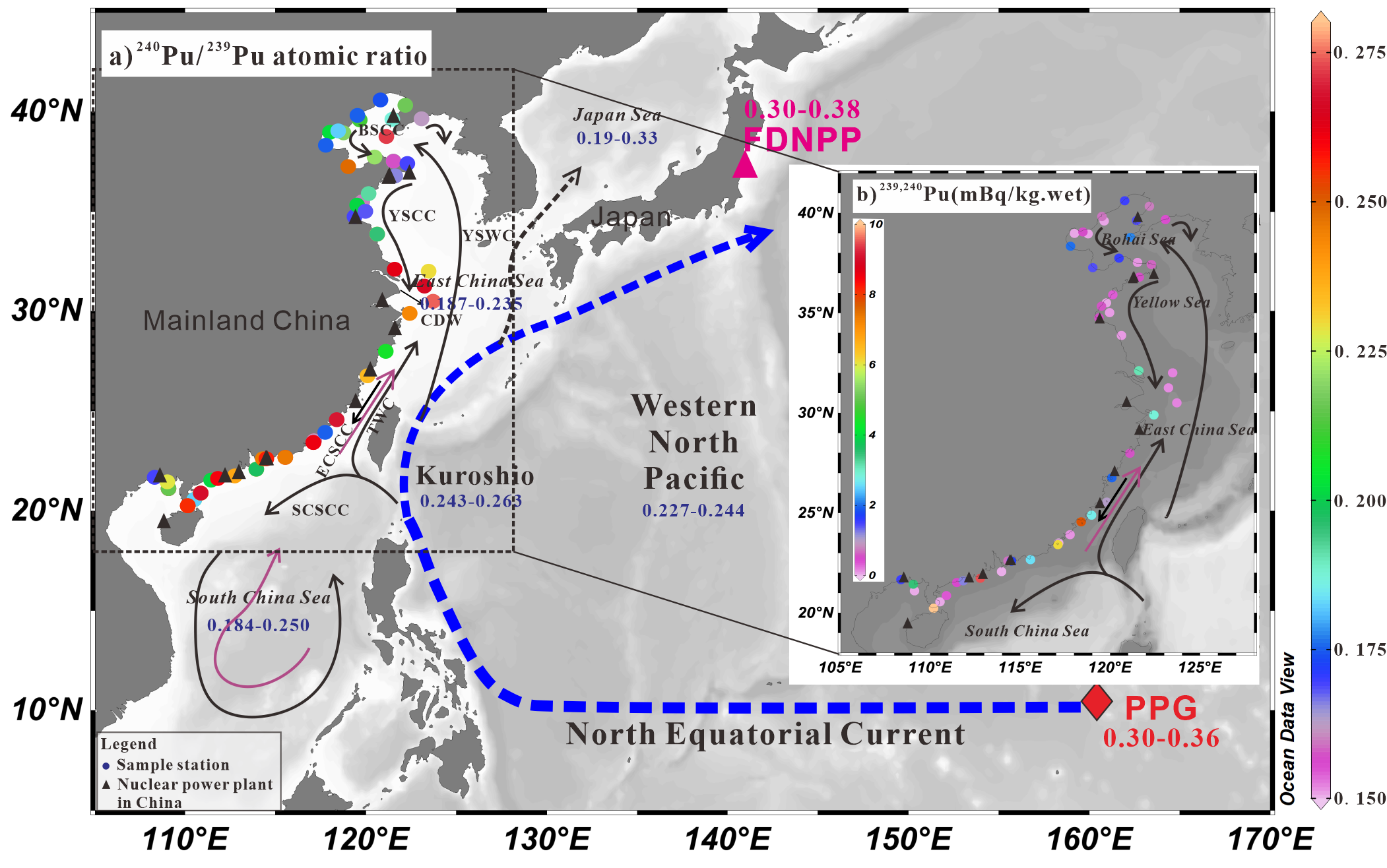 基于以上开发的分析方法,首次系统分析了我国边缘海不同生物样本中钚同位素水平和分布,探讨了放射性同位素钚的主要来源,评估了其生态辐射风险,深入分析了钚同位素在海洋环境中的迁移和富集机制。研究结果表明,公众通过食用海鲜摄入的钚所带来的年辐射剂量处于安全水平。239Pu240Pu的浓度在不同物种(如鱼、虾到大型藻类)之间存在差异,且呈现出从鱼类、虾类到大型藻类逐渐增加的趋势,这主要取决于物种类型和生长环境。大型藻类是监测钚同位素污染的理想海洋指示生物。与黄海和渤海相比,东海和南海中观察到的较高240Pu/239Pu比值,揭示了黑潮入侵携带了来自太平洋核试验场(PPG)的高240Pu/239Pu比值的钚(2)