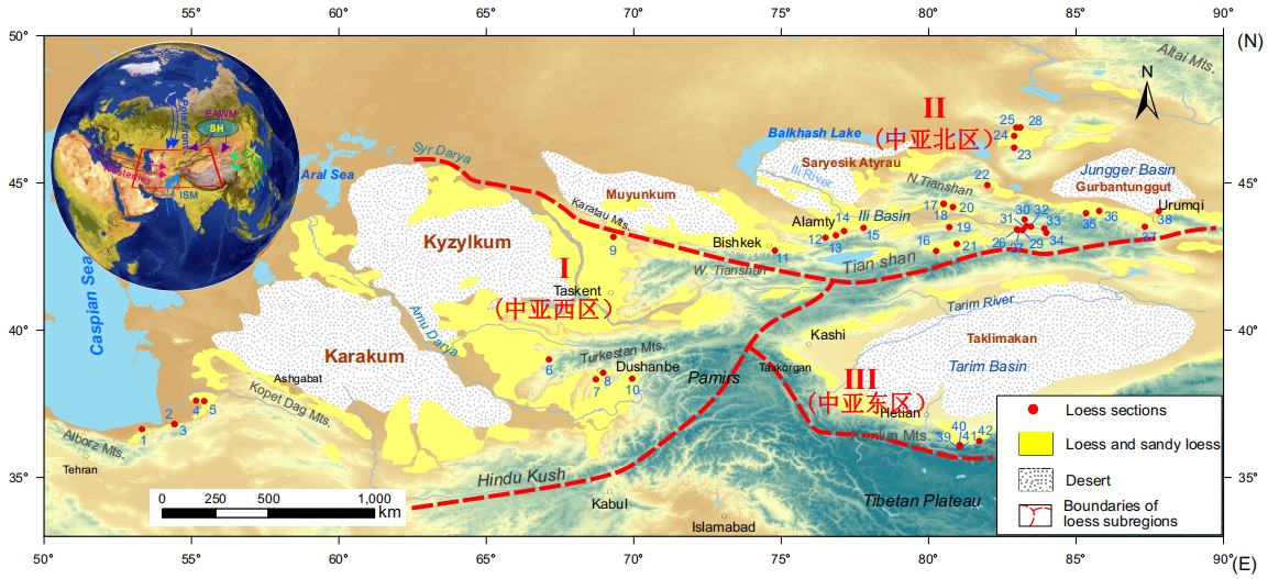 1 研究选取黄土剖面位置、中亚黄土分布及分区图