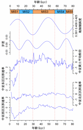 2 中亚集成各子区域沉积速率与中亚黄土平均粒径和地球轨道参数对比