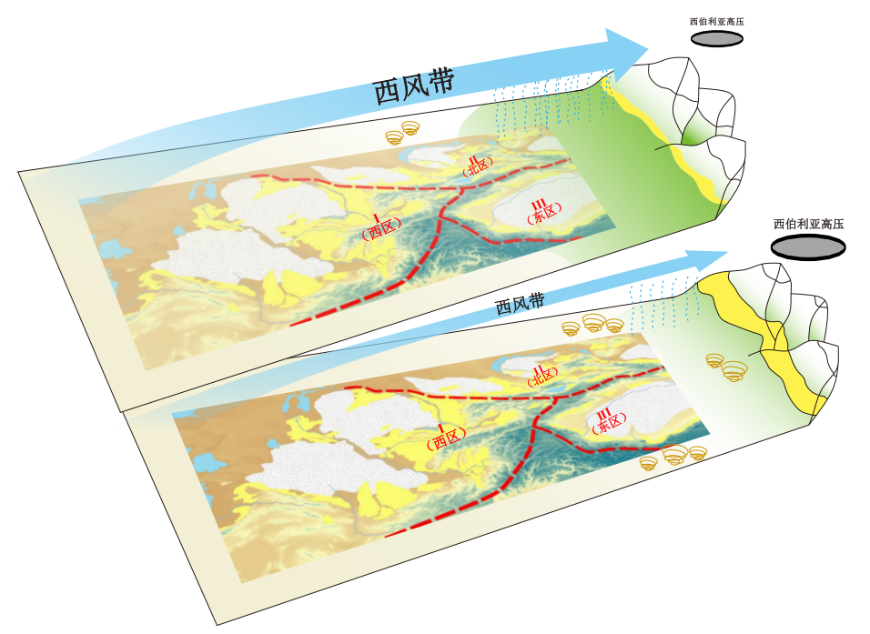 3 轨道尺度上西风增强(上)和西风减弱(下)时沙尘活动的驱动模式示意图