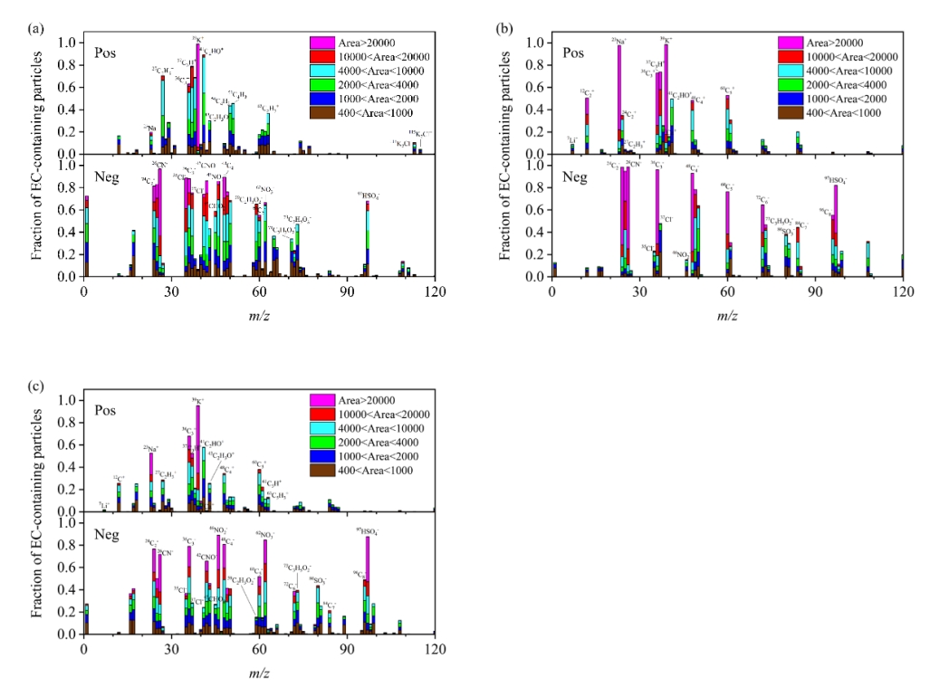 混合态分析进一步揭示:生物质中排放的EC-OC颗粒与59C2H3O2⁻信号高度共现,验证了左旋葡聚糖作为生物质燃烧示踪成分的代表性。此外,各类型含EC颗粒均表现出不同程度的硫酸盐混合现象,表明民用固体燃料燃烧过程自身亦可直接贡献大气中观察到的“老化”EC颗粒的内混态特征。这一发现打破了“硫酸盐包裹源自大气老化”的传统认知,为大气二次组分来源解析与气候模式优化提供了重要支撑。