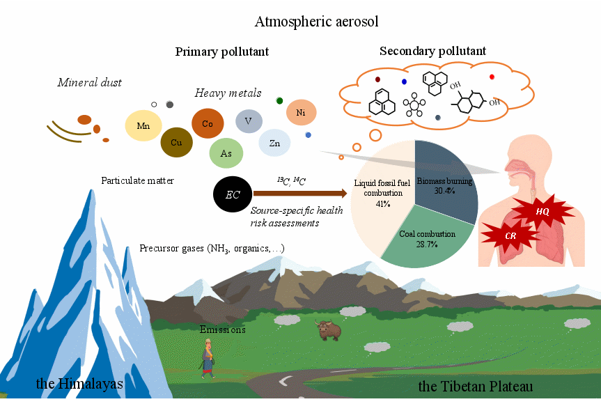 重金属(Heavy metals, HMs)与元素碳(Element carbon, EC)是大气颗粒物的重要组分,HMs主要来自于化石燃料燃烧、工业过程和沙尘暴等人为和自然源排放,EC主要来自于含碳物质的不完全燃烧。HMs和EC不仅影响区域空气质量和能见度,同时也具有重要的健康效应。青藏高原因其独特的地理单元影响着大气污染物的传输、转化和累积,加之毗邻东亚和南亚等大气污染物高排放区域,使其更易受到HMs与EC的影响,开展HMs和EC健康暴露风险评估,进一步探究该区域HMs和EC溯源健康效应具有重要意义。