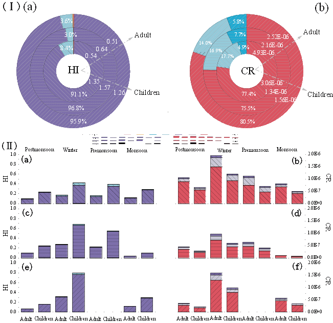 图2 (Ⅰ)阿里、青海湖与北麓河三站点大气重金属(HMs)年均危害指数(a)与致癌风险(b)贡献,(Ⅱ)阿里(a,b)、北麓河(c,d)和青海湖(e,f)的危害指数与致癌风险季节贡献