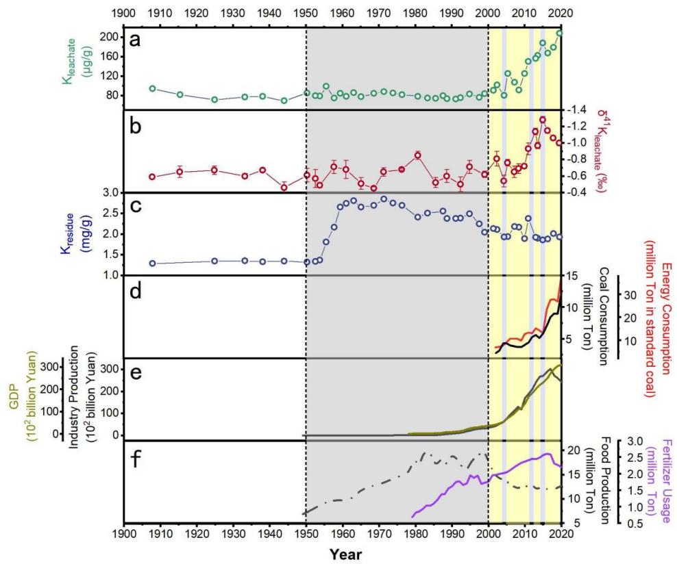 该研究表明,湖泊沉积物中的K同位素信号能够清晰反映与区域经济发展相关的自然过程与人类活动,并为流域侵蚀、能源利用、大气污染及其治理政策等变化提供了有价值的信息。尽管钾是一种地壳中丰度较高的主要元素,通过相态提取仍可有效区分其自然来源与人为输入,从而使K同位素在示踪大气、水体、土壤和沉积物中人为因素对K地球化学循环方面展现出潜力。