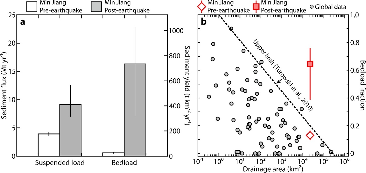在构造活跃的山区,大规模地震常常引发广泛的滑坡。这些滑坡将土壤和岩石搬运到河流系统中,抬高河床并增加洪水风险。同时,河流清除滑坡沉积物的过程对山地演变具有重要影响,且通过岩石侵蚀、风化和有机碳搬运,进而对全球碳循环产生影响。然而,地震引发的滑坡物质对河流到底有什么样的影响,特别是粗颗粒物质的搬运速率,由于很难准确测定,是一项国际性的挑战难题。