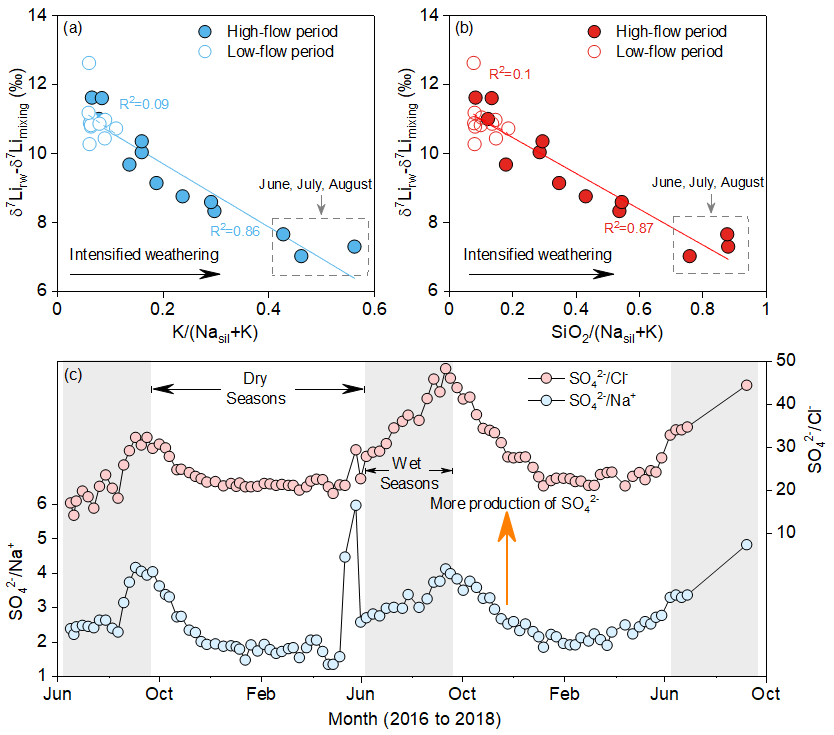 为探究δ7Li的分馏行为如何响应硫化物氧化的风化过程,研究团队将硅酸盐岩风化强度指标K/(Nasil+K)、SiO2/(Nasil+K)与Li同位素分馏程度(δ7Lirw-δ7Limixing)进行了详细对比。结果发现:旱季δ7Li相对保持稳定;而相比之下,在雨季时期,硅酸盐岩风化强度与河流δ7Li分馏呈显著负相关关系,具体表现为硅酸盐岩风化强度越高,河流δ7Li分馏越小(图2a-2b)。这是因为在雨季时期,受到强季风降雨、冰融水的驱动,高山冰川流域的侵蚀速率快速加强,硫化物的暴露及氧化速率加快,生成的硫酸进一步导致了硅酸盐岩矿物以均一风化为主,次生粘土矿物的生成受到抑制,从而使得次生矿物对6Li吸附减少,河流δ7Li下降。与此同时,季节性水化学数据也证实,老虎沟流域内雨季的硫化物氧化速率显著高于旱季,SO42−产出速度在雨季达到最高,表现在雨季SO42−/Na+ 和SO42−/Cl−的比值比旱季高出2-5倍(图2c)。