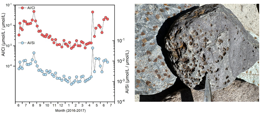 在此过程中,该研究也进一步观察到雨季期间二次矿物形成受“抑制”的现象。前人研究指出,次生矿物形成过程中会优先吸附溶解态Al,而老虎沟流域河水溶解态Al/Si和Al/Cl比值呈现夏季高、冬季低的趋势,说明雨季受到增强的硫酸产出的影响,粘土矿物形成受到“抑制”,河水溶解态Al的吸收能力明显减弱(图3)。