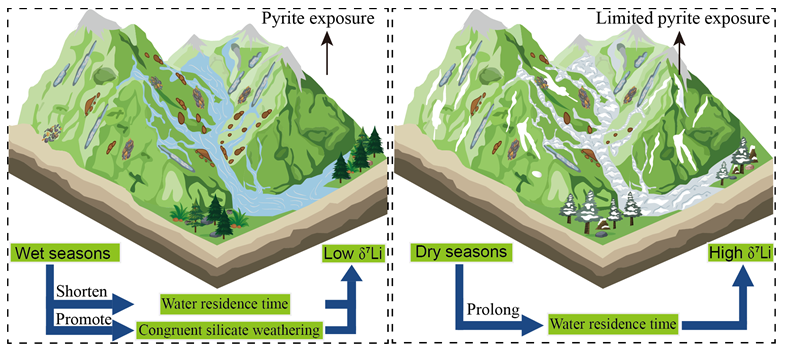 重要的是,除了硫酸盐氧化的影响,该研究还指出河水δ7Li也同时受到季节性水文变化影响。夏季强降雨和冰融水驱动的快速地表径流,一方面加速了地表侵蚀、硫化物的氧化和硫酸产生;另一方面,快速地表径流也导致了相对短的水岩反应时间,两者均不利于粘土矿物的形成,最终导致Li同位素分馏受限,产生雨季低的河水δ7Li值(图4)。