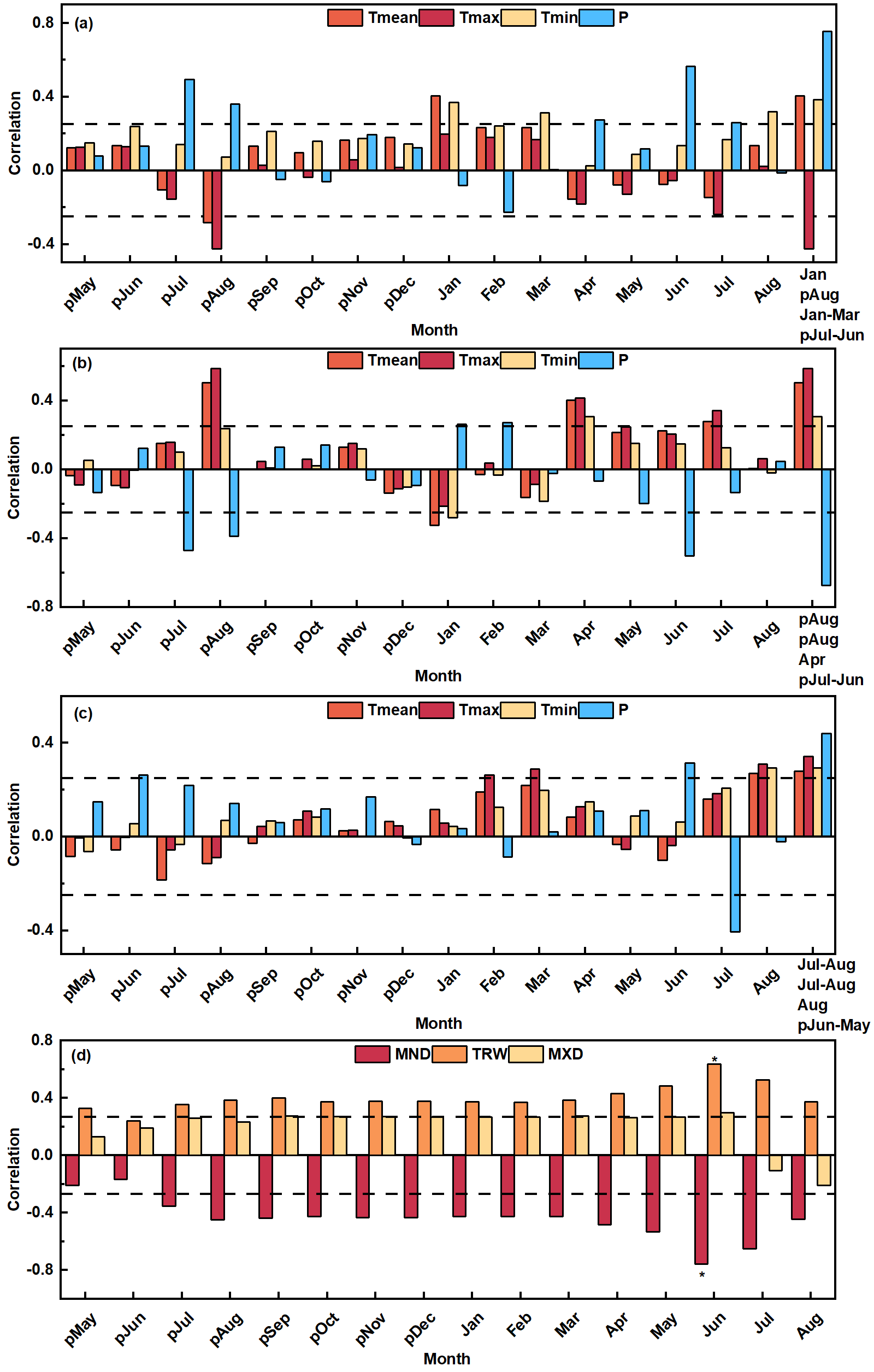 图1 中天山树轮宽度(a)、最小早材密度(b)和最大晚材密度年表(c)与气候因子以及标准化降水蒸散发指数(d)的相关分析结果