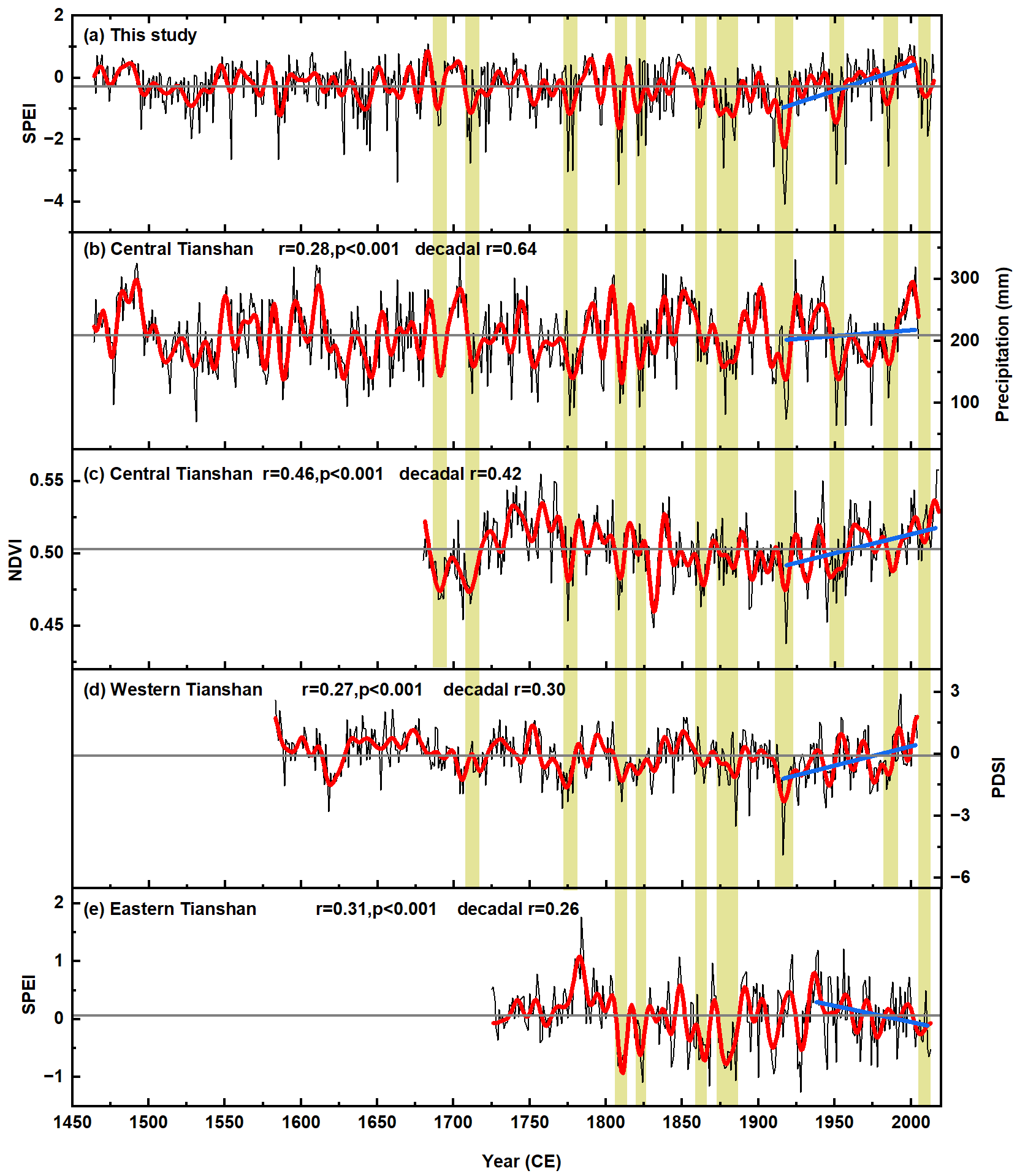 与其他天山气候重建序列的对比结果(图2)表明整个天山的气候变化存在显著的相关关系。在十年际尺度上,中天山和西天山的干旱期比东天山更为同步。SPEI-126重建显示,天山地区的干旱通常表现为连续三年的干旱。例如,最严重的干旱期发生在1916–1918年,第二严重的干旱期为1808–1810年。持续时间最长的超级干旱从1871年持续到1885年,涵盖了整个天山山脉。在1916–1918年极端干旱事件之后,天山山脉不同水文气候序列的趋势变化出现了分歧。中、西天山地区在极端干旱事件后呈现湿润化趋势,可能与西风带水汽输送增强密切相关;而东天山近期的干旱化趋势则可能受盆地热力效应与局地环流调整的影响更为显著。