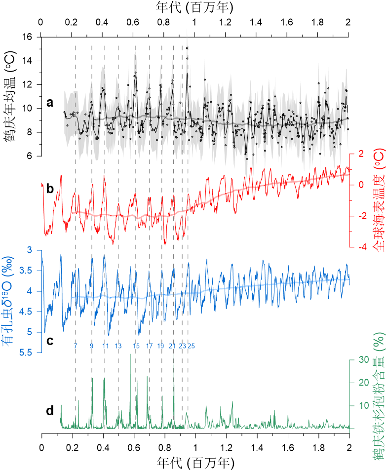 图1. 过去200万年记录对比。(a)GDGTs重建的鹤庆盆地年平均温度变化;(b)全球海表温度集成(Clark et al., 2024);(c)深海氧同位素集成,与全球冰量有关(Lisiecki& Raymo, 2005);(d)鹤庆钻孔铁杉孢粉含量(An et al., 2011)。