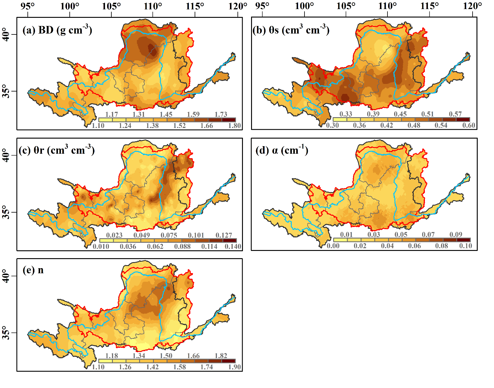 图2 黄河流域1–5 m剖面土壤水力参数空间分布