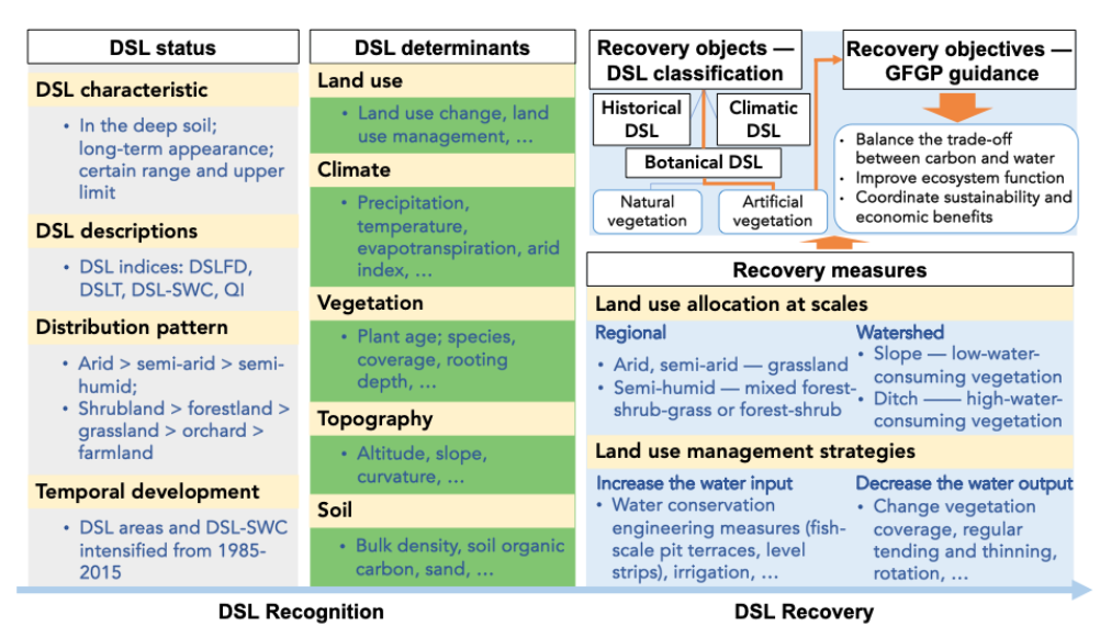 基于黄河流域土壤水力参数的空间分布,团队结合已发表的0–10 m剖面土壤水分数据集,进一步揭示了黄土高原区域尺度土壤干层的时空演化特征,量化了退耕还林草工程的生态水文影响。团队以退耕还林草工程实施时间(1999年)为分界点,分阶段一(1985–1999年)和阶段二(2000–2015年)构建随机森林模型,获得了1985–2015年间黄土高原区域尺度土壤干层的时空分布图谱。对比分析发现,与阶段一相比,阶段二的土壤干层分布由干旱和半干旱区向半湿润区扩展,干层内平均含水量降幅为1.2%,表明退耕还林草工程实施后区域尺度的土壤干层呈加剧态势。为进一步缓解黄土高原植被变绿与土壤干层加剧之间的矛盾,团队在总结了前人研究成果的基础上,提出了在区域和流域尺度整合植被配置、样地尺度加强植被管理的协同建议(图3)。