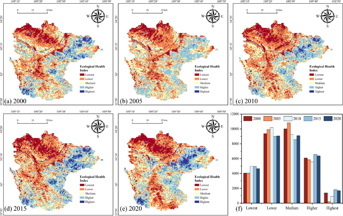 以蓝田县为例,揭示了秦岭-关中平原过渡区生态系统健康受气候因素、地质因素和人类活动的三重影响。2000—2020年间,人类活动显著扩张,加剧了景观生态风险;与此同时,河谷和丘陵地区的生态稳定性有所改善,水土流失总体下降,整体生态健康状况呈现改善趋势(图2)。土壤有机碳、海拔、坡度、降水和温度等地质和气候因素通过个体及交互作用显著影响生态系统健康,而人类活动主要通过增加水土流失和景观生态风险对生态系统健康产生负向效应。气候因素和地质条件是生态系统健康变化的主要驱动力,人类活动的集聚化则是秦岭-关中平原过渡区生态风险上升的关键原因。