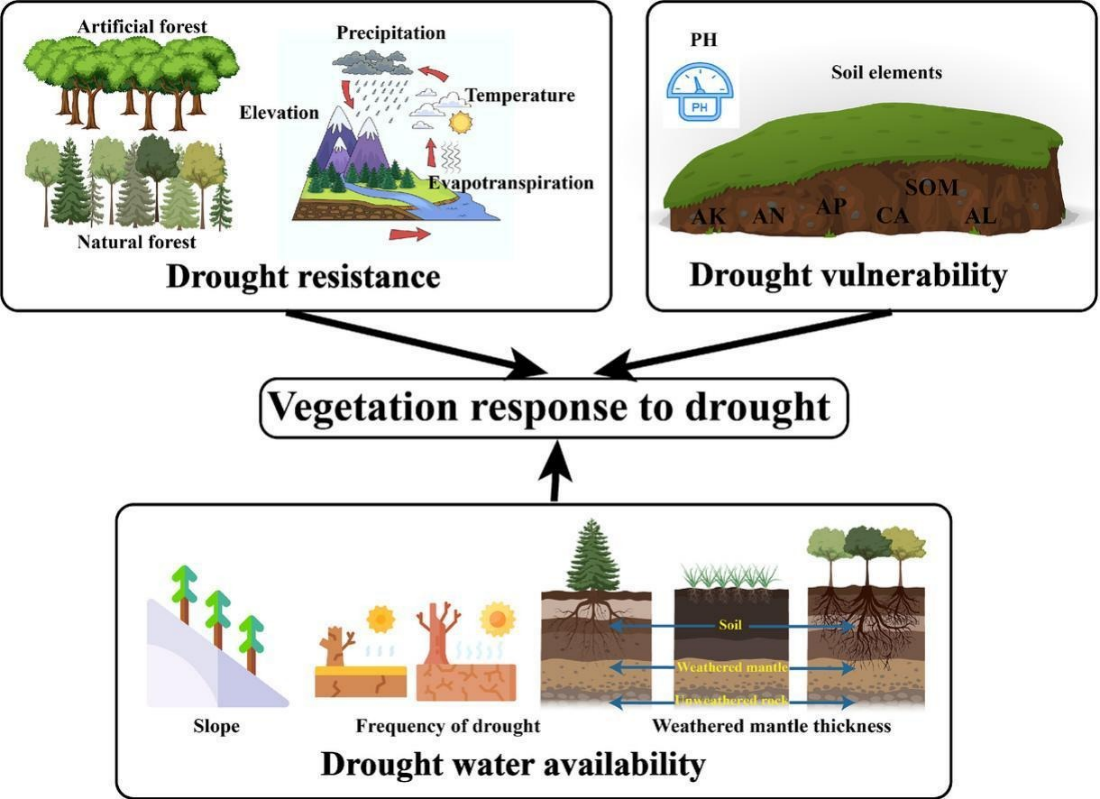 秦岭地区植被对干旱的响应受气候、地形、土壤条件的共同调控(图3)。2001-2020年,秦岭EVI(增强型植被指数)的增幅显著高于GPP(总初级生产力)和LAI(叶面积指数),表明干旱主要抑制GPP和LAI。研究发现,短期干旱在一定程度上促进了秦岭植被的生长,而长期干旱总体上抑制植被生长。海拔、基岩深度和坡度等因素通过影响水分可用性和气候条件调节植被的抗旱性。土壤养分(N、P、K)通过调控生理过程增强植被的抗旱能力,而土壤和风化层的储水能力限制了深根植被在干旱期间的水分获取。人工植被对短期干旱表现出更高的敏感性,天然林在长期干旱期间受水分限制的影响更明显。
