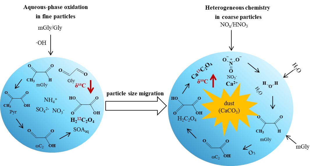 沙尘粒子作为全球陆源气溶胶的主要组成部分,其新鲜粒子通常呈疏水性。然而在老化过程中,沙尘表面形成的硫酸盐、硝酸盐等二次组分,能显著增强其吸湿性与反应活性,使之成为液相二次有机气溶胶(aqSOA)生成的重要介质。以往外场观测表明,沙尘事件期间超微米颗粒中常出现草酸盐与硝酸盐的共存现象,揭示沙尘表面可能参与并促进了二次有机酸的形成,但仍需更多观测资料证实。