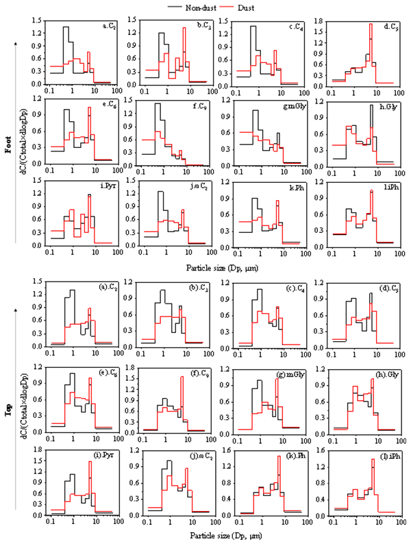 为探究关中地区近地面人为污染对高山自由对流层大气环境的影响,中国科学院地球环境研究所气溶胶理化过程及环境效应团队在华山开展系统观测,并在之前的研究中发现,夏季白天的谷风可将地表的污染物输送至山顶影响自由对流层的化学组成,但冬季低温导致的边界层压低显著抑制了局地污染物向山顶的扩散,使高海拔地区气溶胶主要来源于远距离输送。本研究进一步聚焦于冬季观测期间的一次强沙尘事件,分析沙尘传输过程中近地面和山顶大气气溶胶中二元羧酸类SOA的分子组成和稳定碳同位素分布的垂直差异。结果表明:非沙尘期,草酸(C2)主要通过在细颗粒物中的液相氧化反应生成;而在沙尘期间,其形成路径则转变为在粗颗粒物表面的非均相化学反应(图1)。高海拔站点大气颗粒物主要源于远距离输送,受沙尘影响尤为显著,具体表现为:气溶胶老化指标增强(C2/C4比值升至7.75,图2)、δ13C值富集(较非沙尘期增加+8.3‰,图3)以及C2从细模态向粗模态的明显迁移(图4)。研究指出,粒径分布的转变与沙尘老化过程中形成的Ca(NO3)2吸湿性涂层密切相关,其催化的表面氧化反应与金属-草酸盐络合作用产生协同效应,共同导致δ13C显著富集。本研究阐明了沙尘老化过程中C2生成路径、粒径分布及δ13C特征的改变,并揭示了其显著的海拔差异性,为理解沙尘传输过程中二次有机气溶胶的转化提供了关键依据,并深化了对山地大气化学和区域气候效应的认知。