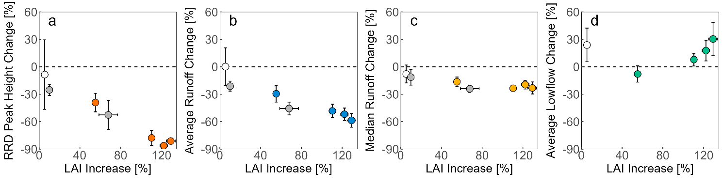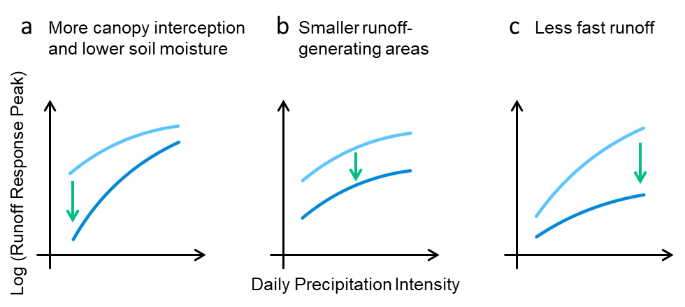 研究发现,植树造林可使流域径流响应峰值降低最高达86%,该降幅与植被覆盖度的增长幅度成正比,且远超过平均流量(最大降幅59%)和中值流量(最大降幅24%)的降幅(图1)。此外,径流响应峰值的降低在极端降水事件中最为显著(即使以百分比计算亦是如此),而非在低中强度降水事件中。这一结果表明,植树造林后径流响应的削弱并非主要源于林冠截留增加或土壤水分亏缺增加,因为这类机制会对低中强度降水事件下的径流响应产生更强的影响。相反,径流响应峰值的变化更可能源于产流面积的缩小以及土壤入渗能力增强导致的快速径流路径减少(图2)。值得注意的是,在植被覆盖度增长最为显著的三个流域中,低径流量并未下降,反而出现一定程度的增加,最大增幅可达25%(图3)。