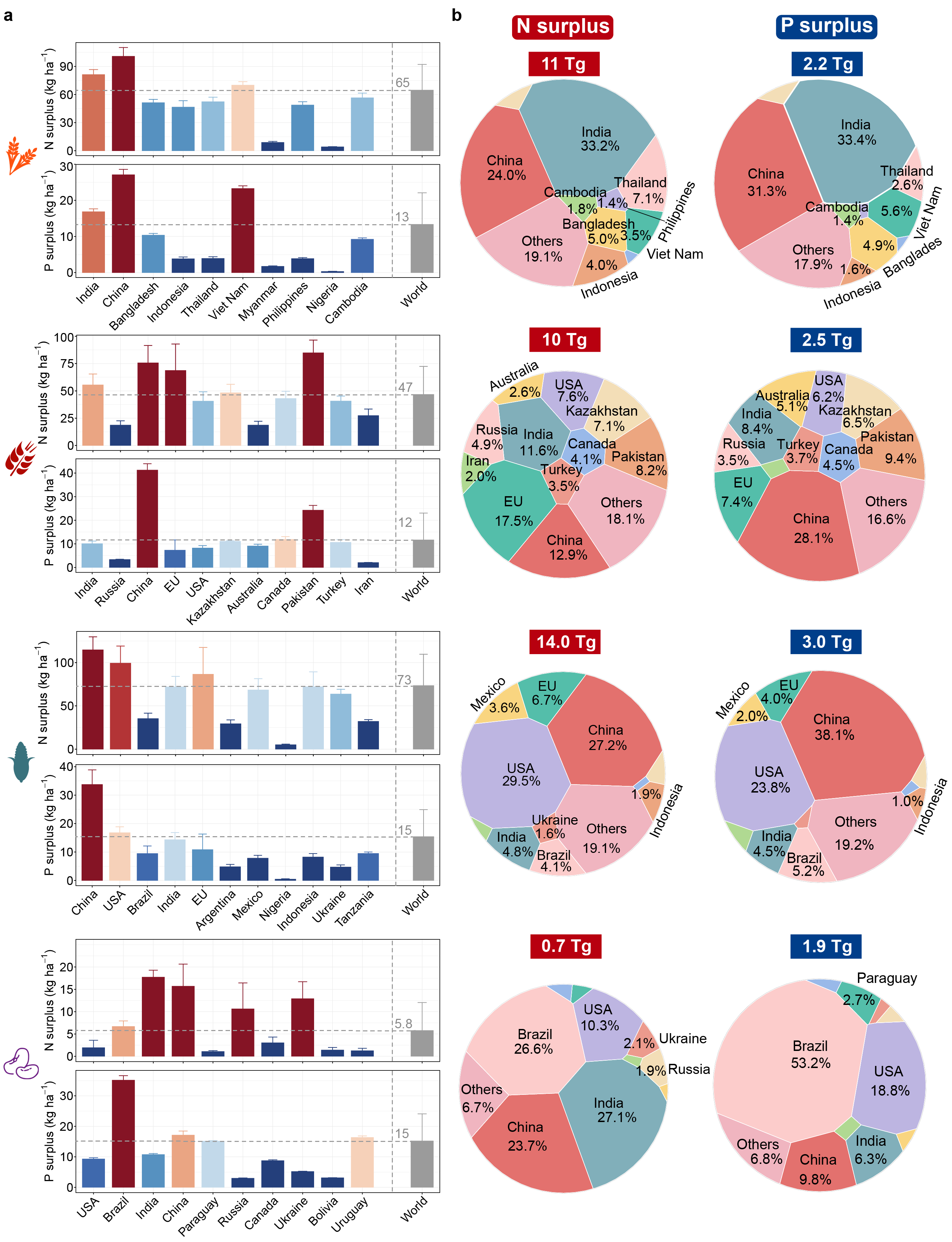 研究发现,不同作物和地区的效率表现存在显著差异。水稻在热带地区、小麦在温带地区通常表现出相对较高的养分利用效率,而玉米在中国、美国等主产区则呈现明显的“高投入—低利用”特征,成为需要重点关注的优化区域。特别值得注意的是,四大作物的磷利用效率普遍低于50%,表明作物磷营养在很大程度上仍依赖土壤原有磷库,而非当季施用的肥料。