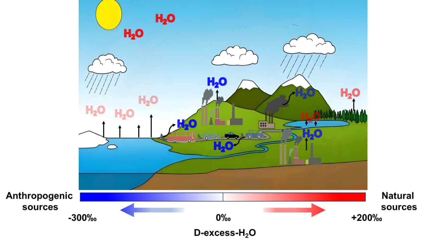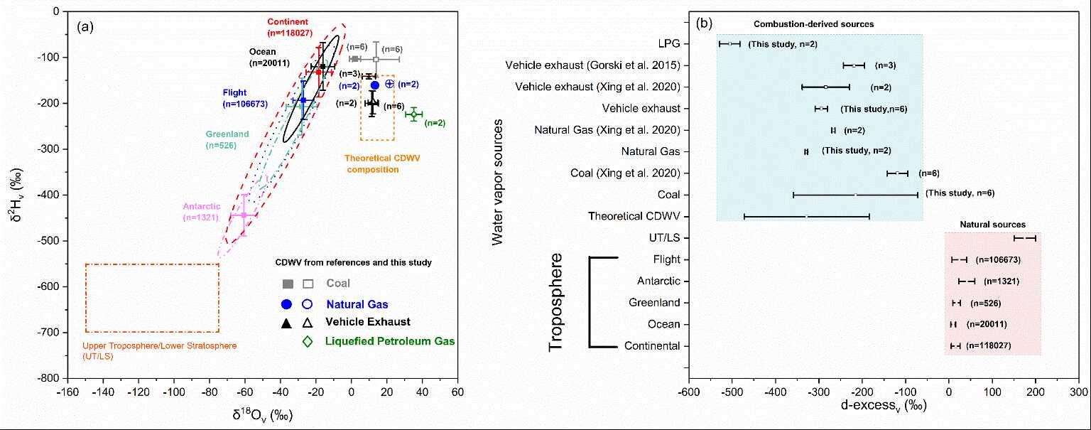 水汽是地球大气的重要组分之一,与地球水循环过程密切相关,其来源主要包括海洋蒸发和地表蒸发、蒸腾等自然过程;然而,化石燃料(如:煤,石油,天然气等)在燃烧过程中除了排放CO2外,与之相伴的也会产生大量的水汽。据估算,每年人类活动产生的化石源水汽占全球大气水库的比例大约为0.17% (大气中的固定水汽含量约为12.7-13.0 103 km3) ,然而,在人类聚集的城市地区,该比例可以达到10%以上。大气水汽含量的升高会给城市带来一系列的负面影响,如:大气污染加剧、太阳辐射减弱、极端天气事件增多、温室效应增强等。因此,急需准确定量化石源水汽在大气水汽中的占比,才能有效评估人类活动对于大气水汽的影响。目前,仅仅通过观测大气绝度湿度、相对湿度、水汽压或者露点温度的变化并不能准确区分自然源水汽和人为源水汽的贡献。然而,自然源水汽和化石源水汽在同位素组成上的巨大差异为我们提供了可能性(图1)。