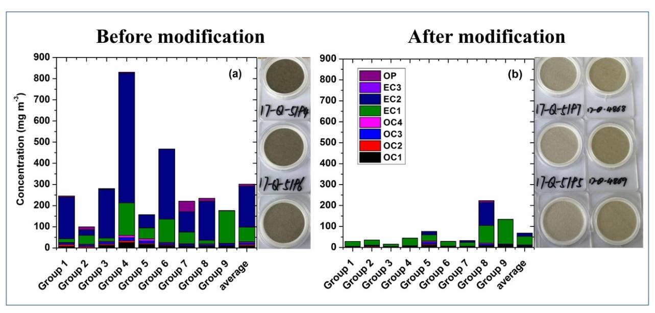 图1. 升级治理前(a)与升级治理后(b)柴油车尾气PM2.5滤膜及其碳组分浓度对比。
