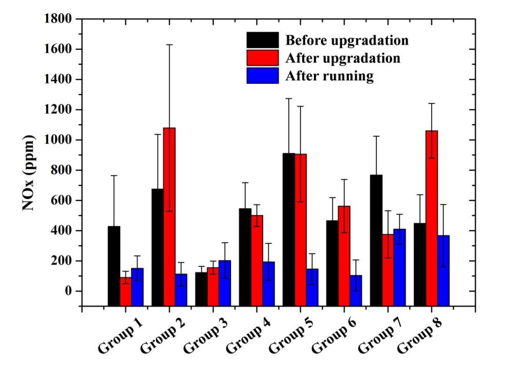 图2. 升级治理前、升级治理后及行驶1500公里后柴油车尾气中NOx浓度变化情况。