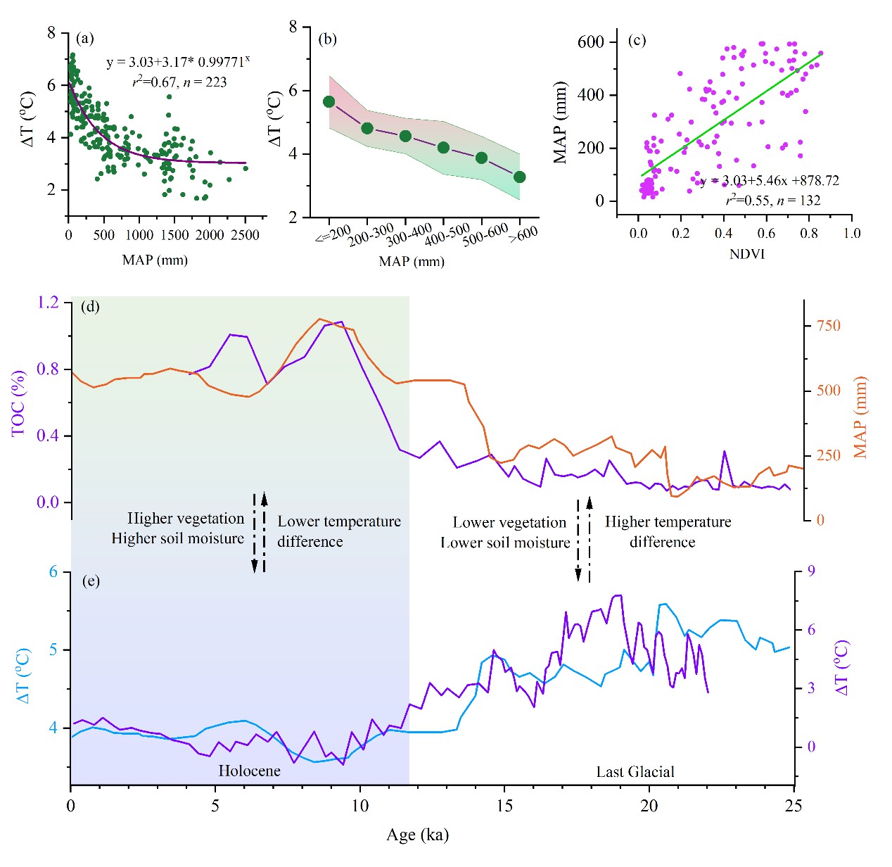 近期,地球环境研究所“极端气候事件及影响”团队(EXCEIS),结合现代观测,古温度重建以及古气候模拟等技术手段,量化了植被对全新世地表和大气温度变化差异的影响,并提出了植被校正地表温度获取全新世气温的方法框架。研究者首先利用对温度敏感的细菌膜脂(brGDGTs)重建了黄土高原西部多哇剖面2.7万年以来的地表温度历史,发现该区域全新世整体呈降温趋势,这与现有气候模型的“中全新世大暖期”理论以及古土壤发育特征存在矛盾。接着通过现代气象数据,揭示了植被/土壤湿度是调节区域地表温度和大气温度差异的关键因素,并量化了这些影响(图1)。最后,根据现代过程结果,将区域过去的地表温度转化成大气气温。结果显示,气温在早全新世上升,中全新世达到最高,而晚全新世逐渐降温(图2)。这一三阶段模式与全球气候重建结果基本一致。本研究通过植被与水分反馈机制,调和了地表温度与气温趋势的分歧,对更好的阐明陆-气热力相互作用、优化古气候代用指标与模型的对比具有重要意义。