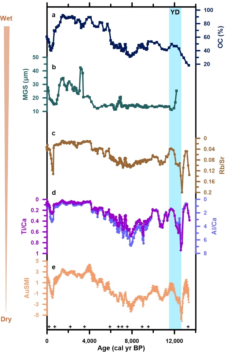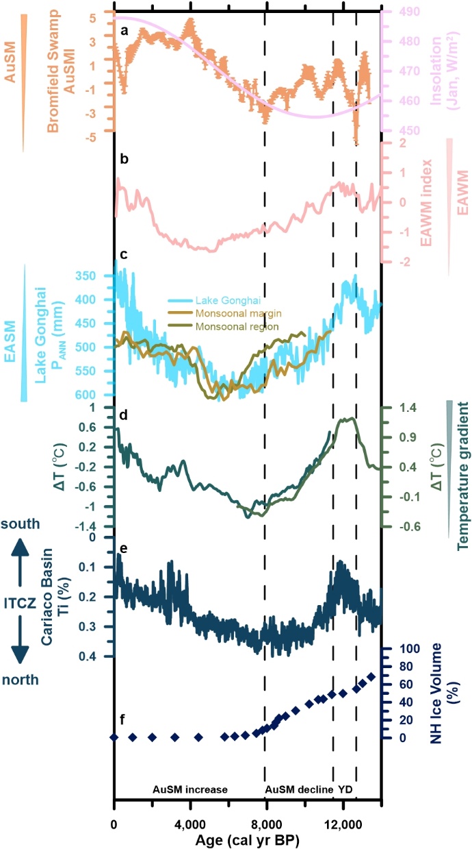 中国科学院地球环境研究所晏宏研究员团队,通过与澳大利亚学者的合作,从澳洲北部热带季风区Bromfield Swamp湖获取了长5.13米的沉积岩心,重建了过去13500年澳大利亚夏季风的变化。结果表明,早全新世11000年-7800年期间,澳大利亚夏季风呈减弱趋势,与南半球夏季太阳辐射增强的现象不匹配,暗示低纬太阳辐射并不是调控热带季风变化的唯一驱动因素。通过与北半球古气候记录的对比分析,研究团队提出,早全新世北半球冰盖撤退导致的东亚冬季风减弱,通过削弱跨赤道气流显著影响了澳洲夏季风的强度,这一结果为轨道尺度上两半球季风的跨赤道耦合联系提供了证据。