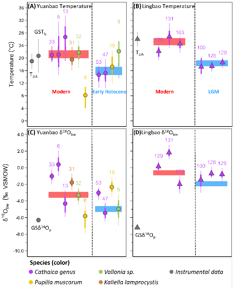 针对上述科学问题,中国科学院地球环境研究所联合荷兰乌德勒支大学,基于中国黄土高原东部灵宝(LB)和西部塬堡(YB)地区现代及化石蜗牛样品(图1),系统开展了不同种属及同一种属壳内高分辨率Δ47与δ18Oshell分析。研究首先评估了现代蜗牛整壳Δ47温度(T47)以及由δ18Oshell和T47计算的体液水氧同位素值(δ18Obw)与生长季温度和降水δ18Op的对应关系;随后结合壳体生长间断特征和壳内δ18Oshell变化,对单个蜗牛壳体进行分段分析,定量重建其季节尺度T47和δ18Obw的季节变化。并进一步将该方法应用于灵宝末次冰期盛期(LGM)和塬堡早全新世(约 11 ka)化石蜗牛壳体,探索不同气候背景下生长季温度和水文条件的季节变化特征。