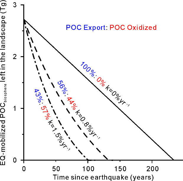 图1 不同氧化速率情形下,岷江流域地震扰动有机碳在震后的河流搬运与氧化