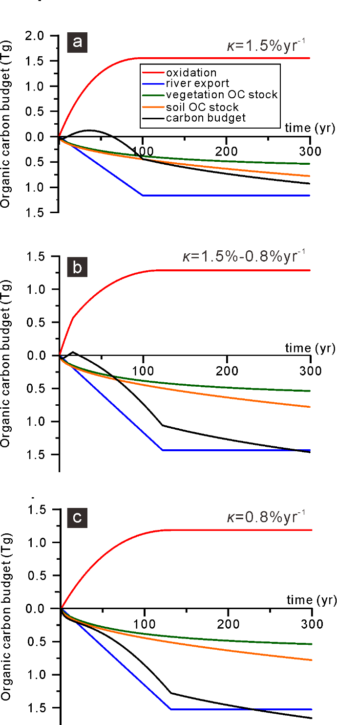最后,该研究团队构建了震后区域碳收支演化模型(图3)。结果显示,尽管强震在瞬时造成巨大生态破坏,但随之而来的植被再生、土壤碳库恢复与颗粒有机碳沉积埋藏能够在数十年尺度上逐步抵消初期有机碳氧化,推动滑坡区碳收支向碳汇方向转变。这一发现表明,强震后有机碳的氧化、河流搬运埋藏以及生态系统恢复共同构成了一个长期演化过程,生态恢复在调节极端事件之后碳循环中发挥着不可忽视的作用。