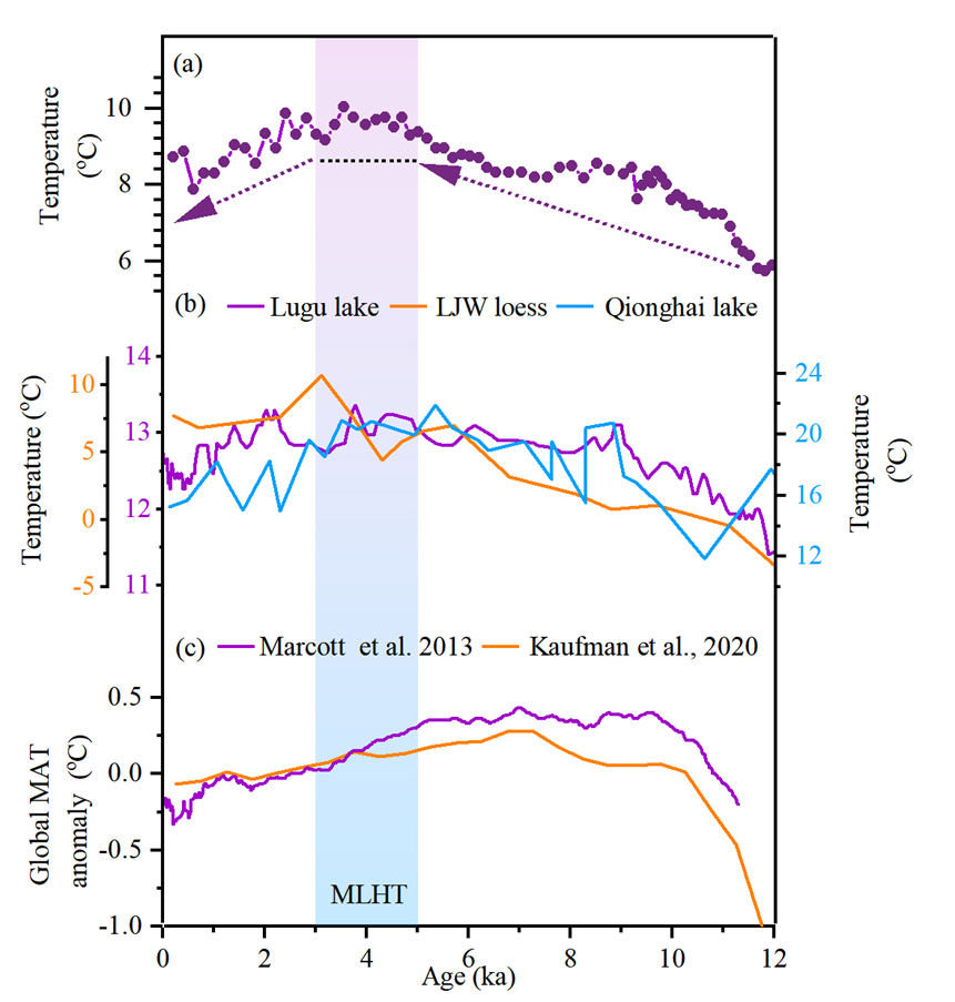针对这一科学难题,地球环境研究所“极端气候事件及影响”团队(EXCEIS)利用青藏高原东北部江西沟黄土-古土壤序列,基于支链甘油二烷基甘油四醚生物标志物,定量重建了该地区过去12000年的地表温度变化记录。