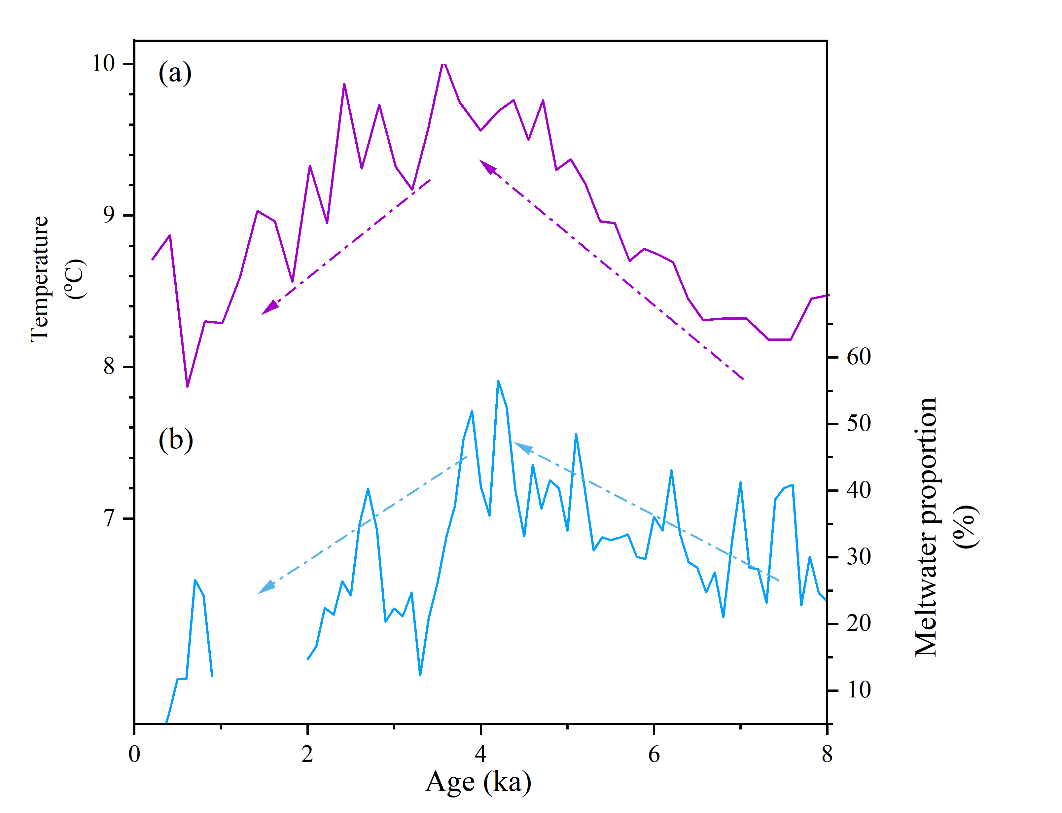 研究发现,与北半球中高纬度地区普遍记录到的早中全新世(距今9000-5000年)大暖期不同,青藏高原东北部表现出一种独特的“滞后”升温模式。该地区在早中全新世经历持续升温,直至中晚全新世过渡期(距今5000-3000年)才达到温度峰值 (图1)。研究人员认为,这种反常的热力机制主要归因于当时太阳活动的增强以及残留冰盖的共同效应。更为重要的是,该研究揭示了温度对高原水文过程的关键控制作用。记录显示,这一滞后的高温期与该区域显著增强的融水事件在时间上呈现出高度耦合特征(图2)。这表明,中晚全新世的升温直接驱动了冰冻圈(冰川/冻土)的消融,导致了融水的增加。