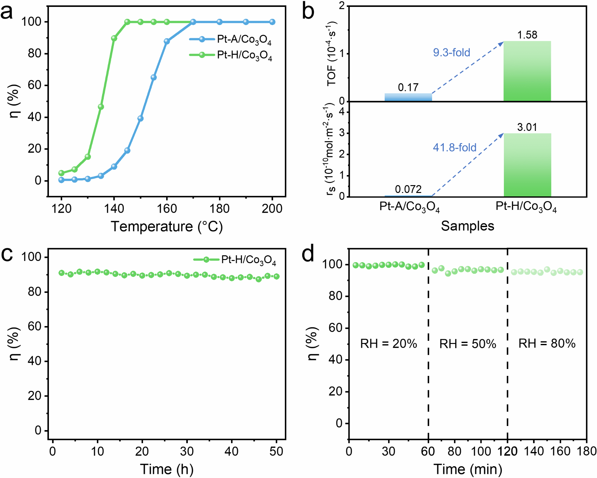 图2. 零价铂单原子与高价铂单原子的甲苯催化氧化性能对比