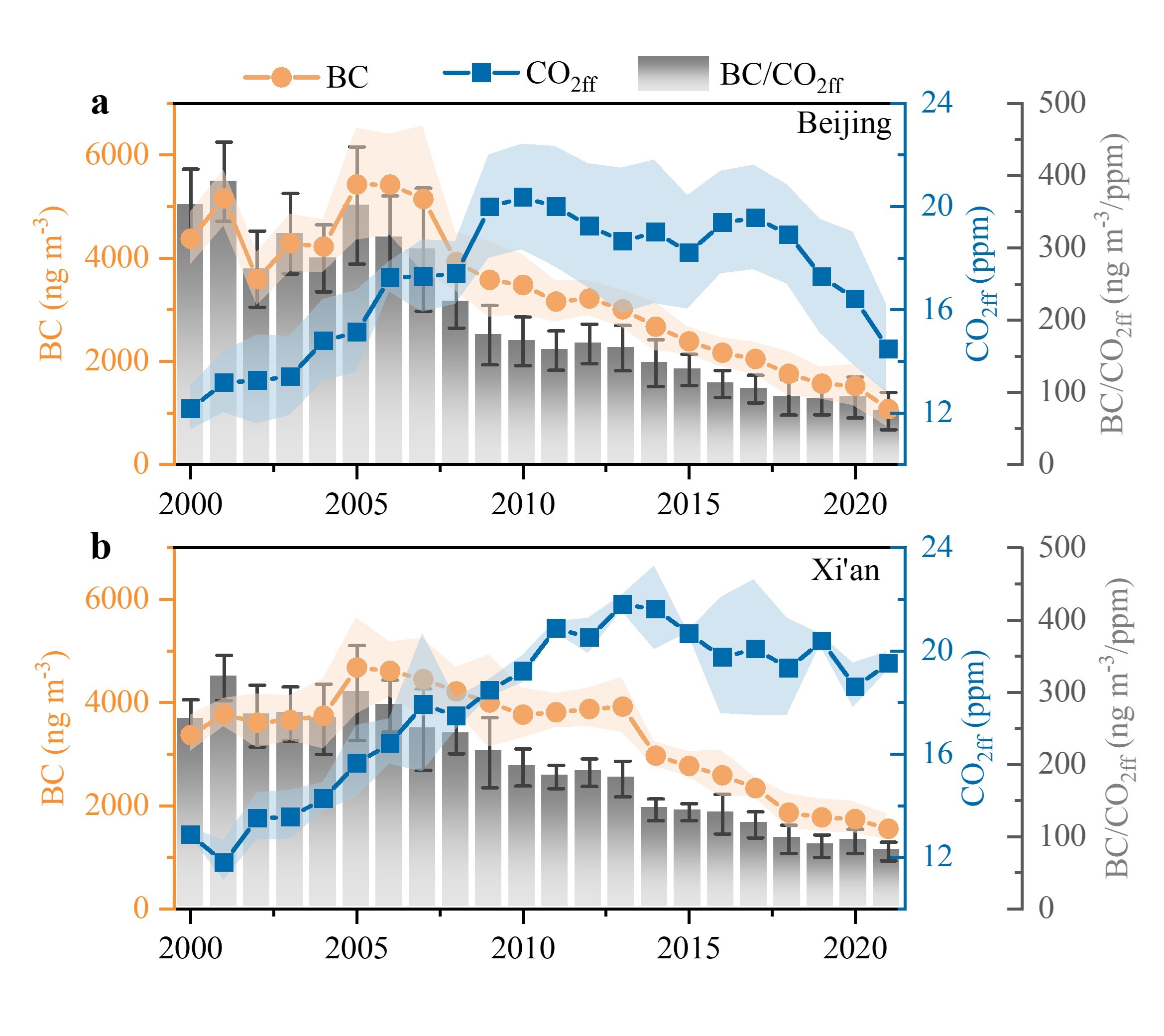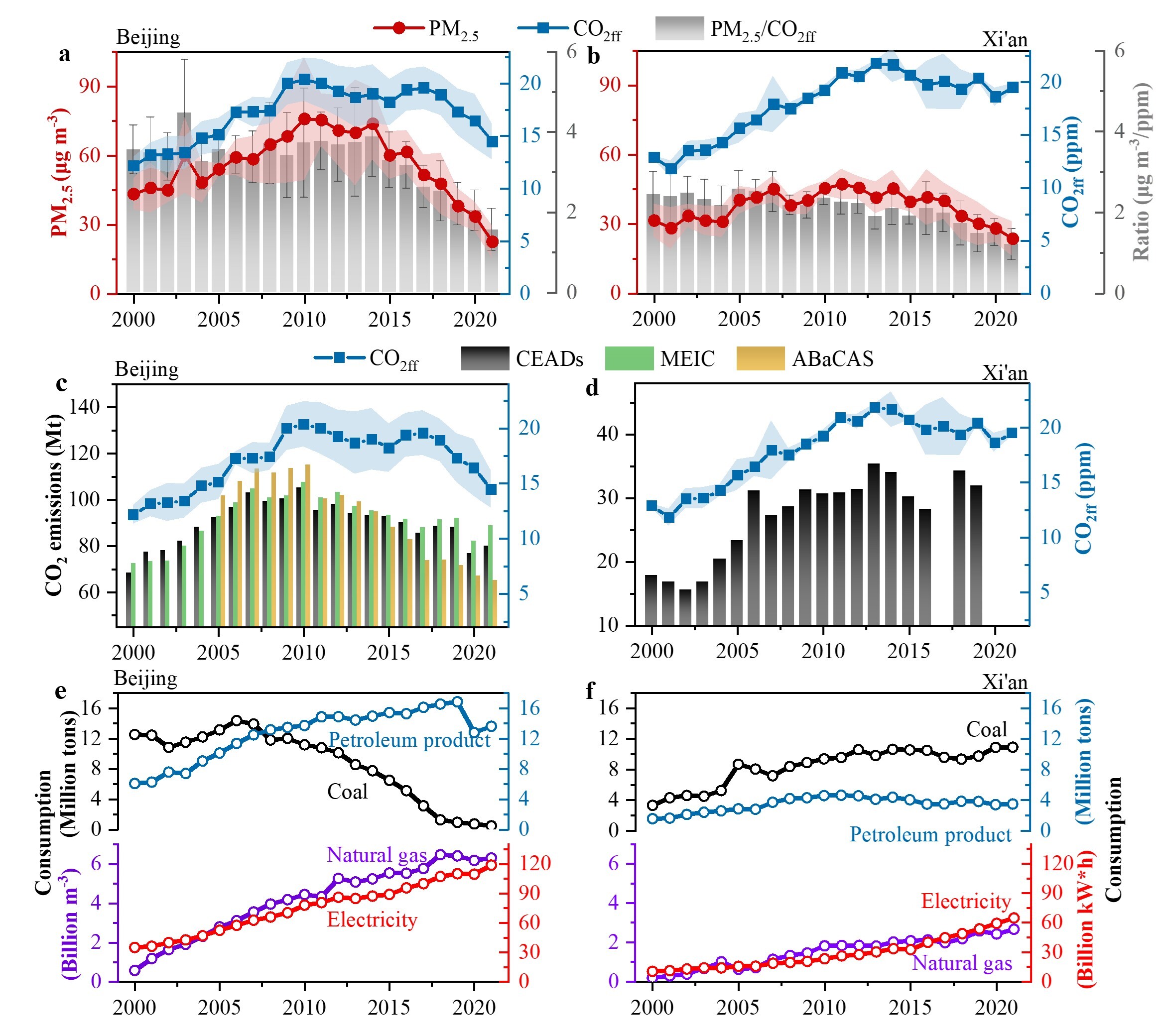 中国科学院地球环境研究所牛振川研究员及其团队通过对北京和西安树轮14C分析,重建了2000至2021年CO2ff浓度序列。结合同期的细颗粒物(PM2.5)、黑碳(BC)及一氧化碳(CO)监测数据,研究发现:在2000至2010年代初,两地CO2ff浓度与大气污染物呈同步上升趋势;自2013年系列清洁空气行动计划实施后,均出现明显下降(图1,2)。研究提出并利用PM2.5/CO2ff比值(即单位碳排放对应的污染物强度)作为衡量指标,结果显示,2013至2021年间,该强度在北京和西安分别下降了58 ± 25%和36 ± 21%(图1),反映空气污染控制效果的持续提升。进一步通过BC/CO2ff与ΔCO/CO2ff比值评估燃烧效率变化,显示两地燃烧效率在2013年后显著改善:北京两个比值分别下降54 ± 19%和44 ± 19%,西安下降幅度分别为56 ± 10%和65 ± 24%(图3,4)。这些结果有力证实,我国在空气污染治理和提升燃烧效率方面取得了实质性进展。