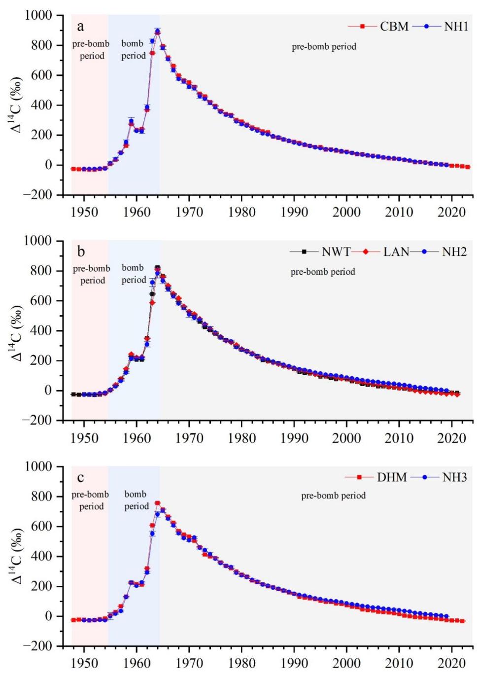 图3 1948-2023年间长白山(a)、南五台(b)、鼎湖山(c)树轮Δ14C与北半球背景Δ14C的时间序列对比图。北半球Δ14C背景数据源自Hua et al.(2022)。