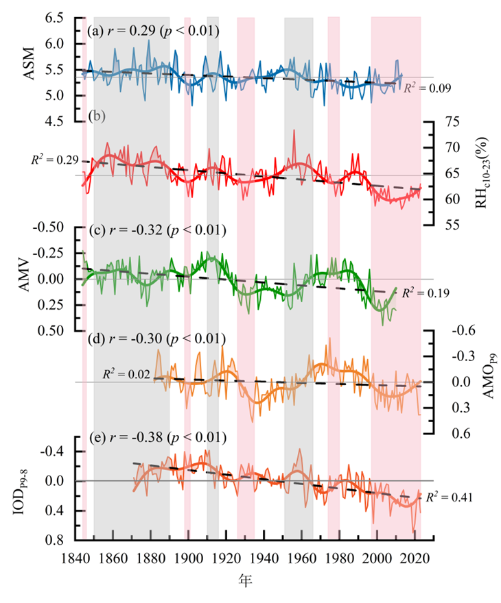 重建序列清晰记录了1844年以来的持续干旱趋势,并识别发生在1900年前后、1920年代末期(“民国大旱”)和1940–1943年的三次极端干旱事件。值得注意的是,1997–2023年的干旱强度虽然为研究区近180年之最,但社会经济损失却较历史上类似强度的干旱显著降低,这一发现印证了现代社会气候韧性的显著提升。此外,研究还发现RHc10-23变化受到亚洲夏季风、大西洋多年代际振荡、厄尔尼诺-南方涛动和印度洋偶极子的协同调控(图3)。