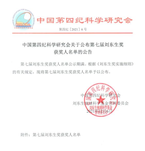2021年12月6日,中国第四纪科学研究会、刘东生地球科学基金管理委员会公布了“刘东生奖获奖人名单”。地球环境所晏宏研究员荣获第七届“刘东生杰出青年奖”。