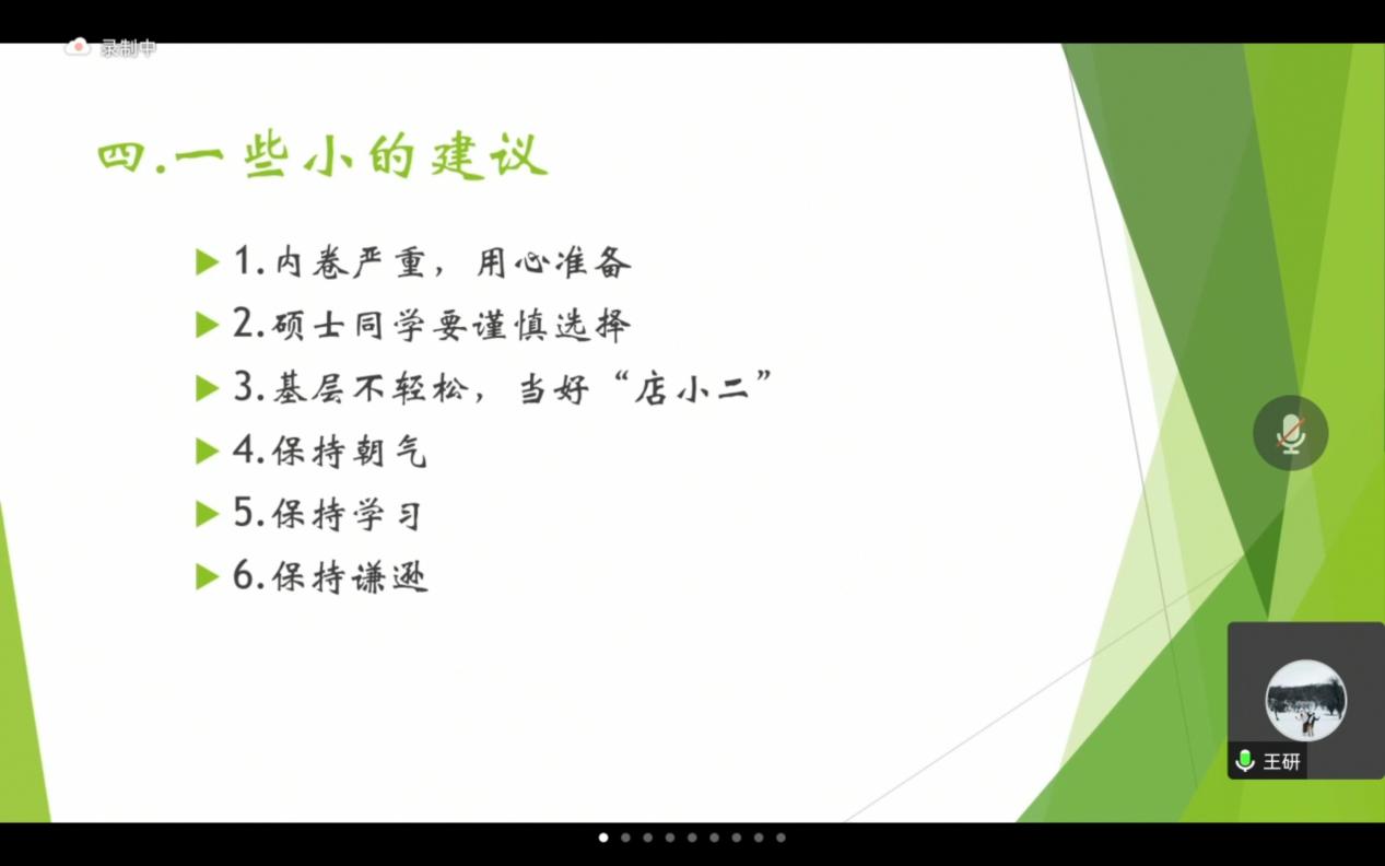 本次分享交流会邀请了2022届毕业生王安琪博士、袁梦娜博士、曾雪莉博士、刘方圆硕士以及2021届毕业生王研博士、成星博士共6位优秀毕业生进行了就业经验分享。他们从提高自身的就业竞争力、求职前准备工作、制作优秀的简历、平衡求职和科研的关系等方面向同学们分享了各自的求职经历和宝贵经验,同时对同学们感兴趣的问题进行解答。分享结束后于学峰处长作总结讲话,他强调,我所研究生的毕业就业目标大多为高校和科研单位,但同学们应根据自身的能力和特长,拓宽就业渠道;鼓励大家从多方面定位,尝试多种行业类型,多方成才,无论从事什么工作,关键是要对社会,对国家有所贡献;同时希望同学们在科研工作之余能够积极加入研究生党支部、学生会,积极为大家服务,在为大家做贡献的同时也能为自己积累丰富的管理经验。