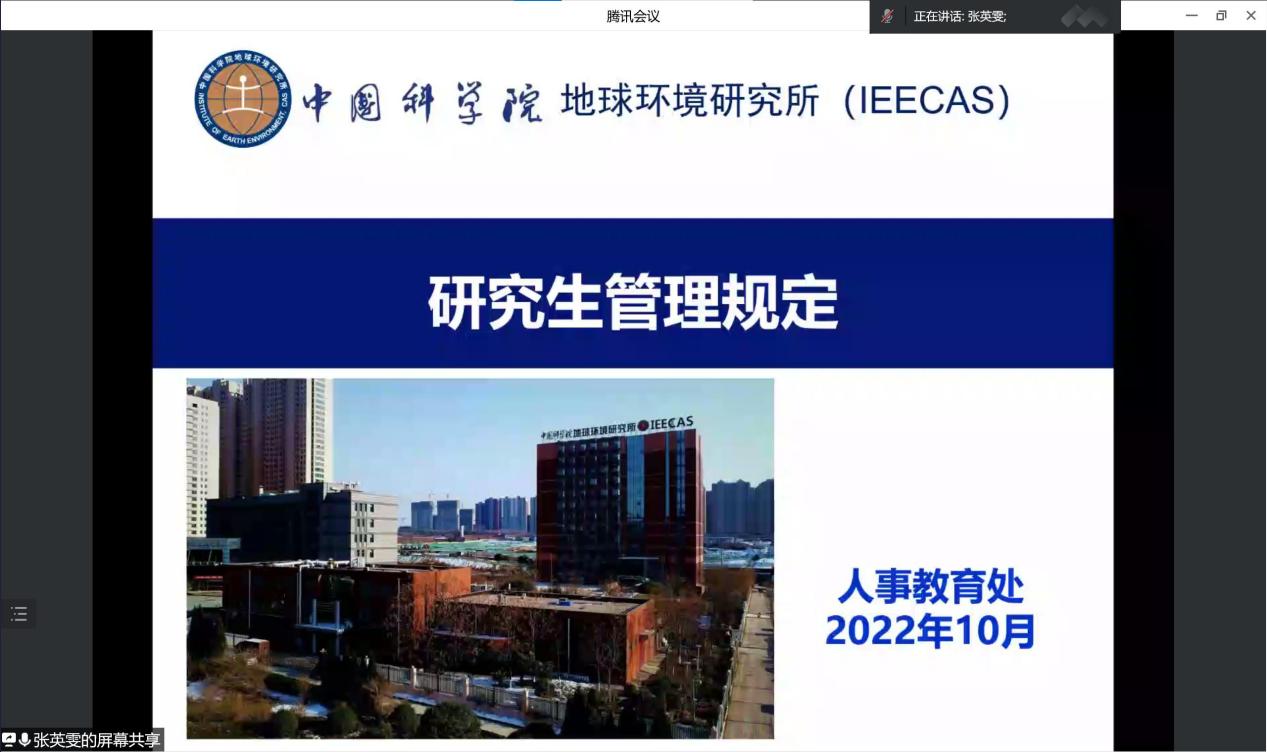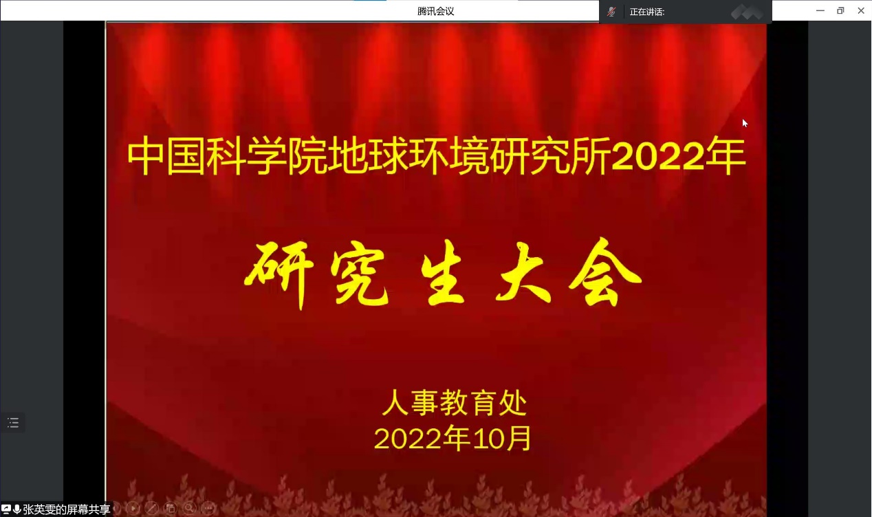 2022年10月13日上午,地球环境研究所通过腾讯会议线上召开了2022年研究生大会,人事教育处及相关处室的领导和老师以及全体研究生一百余人参加会议,会议由人事教育处张英雯老师主持。