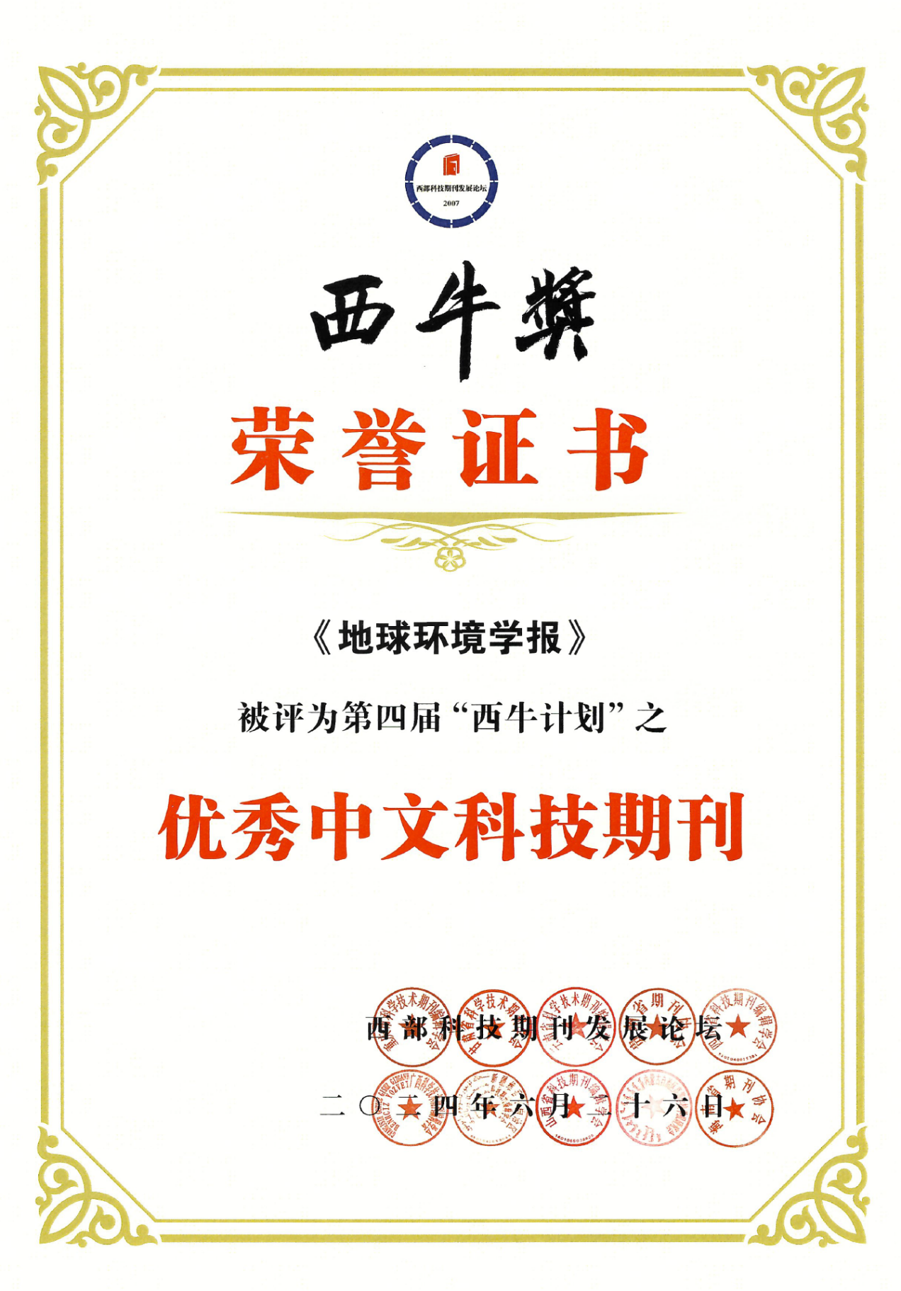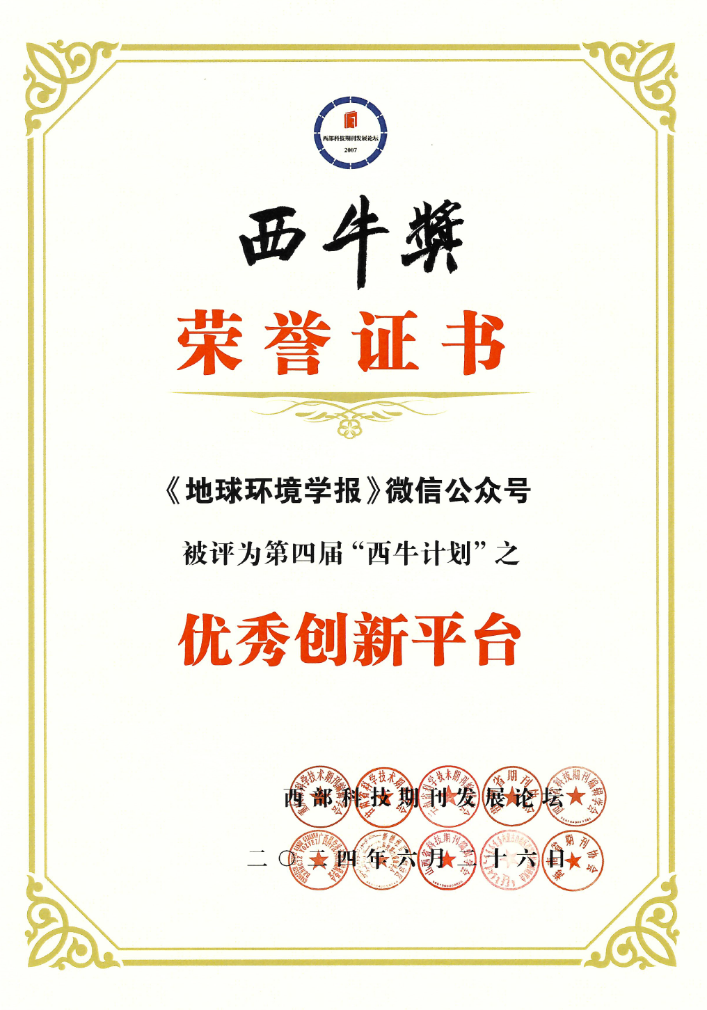 会上举行了第四届“西牛计划”入选项目发布仪式,共评选出“精品中文科技期刊”“优秀中文科技期刊”“高品质英文科技期刊”“优秀创新平台”“优秀编辑学论著”5个奖项。《地球环境学报》被评为第四届“西牛计划”之“优秀中文科技期刊”,《地球环境学报》微信公众号被评为第四届“西牛计划”之“优秀创新平台”。