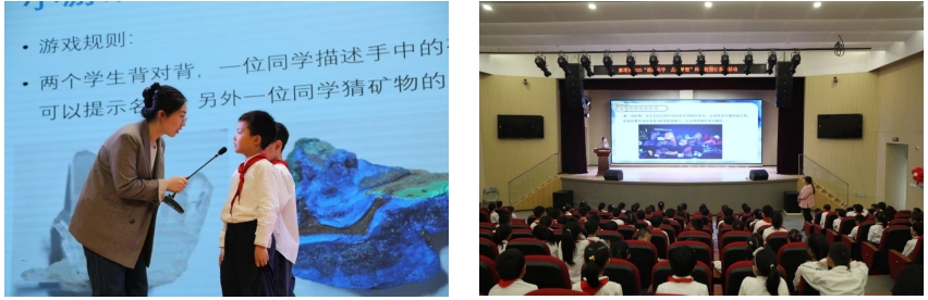 4月15日,地球环境研究所科普主管李洋为雁塔区第一小学带来科普报告《矿物-地球的宝藏》,带领同学们走进神秘的矿物世界,课程以淘金热的故事为引入,介绍矿物对人类经济发展的作用、生活中常见的矿物、以及矿物的形态、颜色、硬度和荧光等相关知识,期间以“你说我猜”的小游戏带动气氛,让同学们学会如何描述矿物特征,通过特征来辨别矿物。